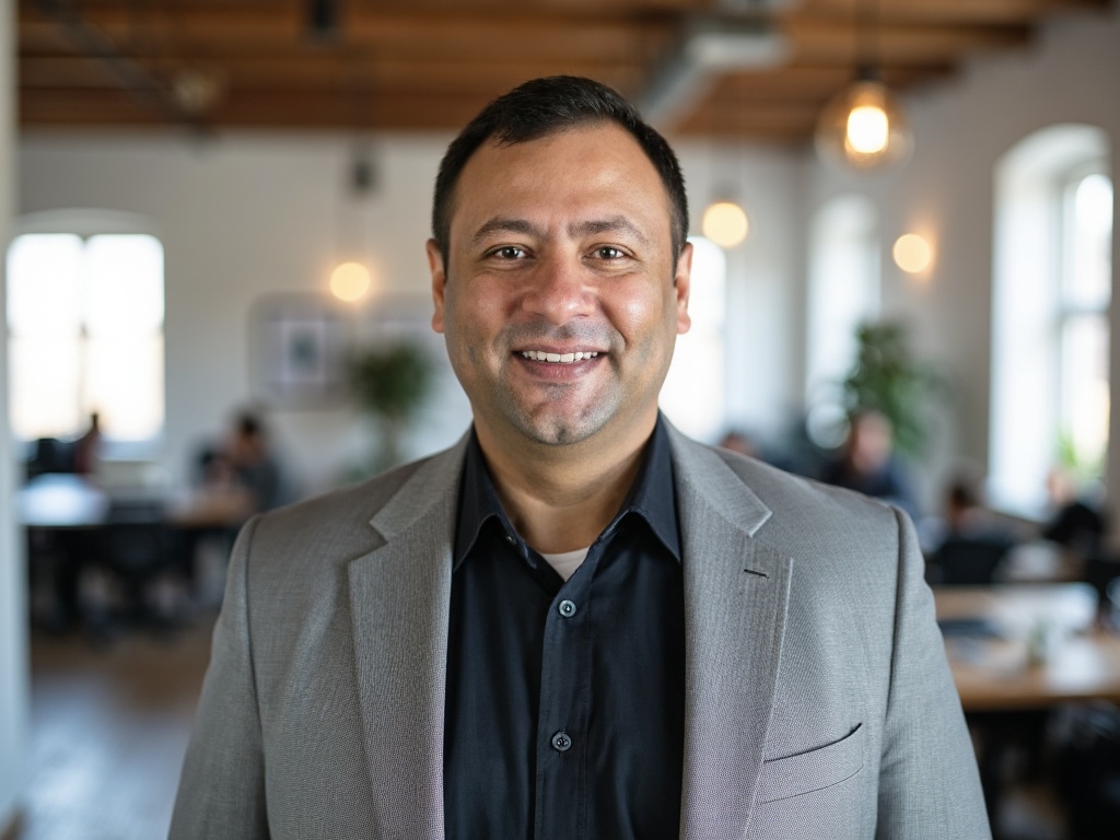 A mid-30s man in a tailored gray blazer and black shirt, standing casually yet confidently in a co-w...