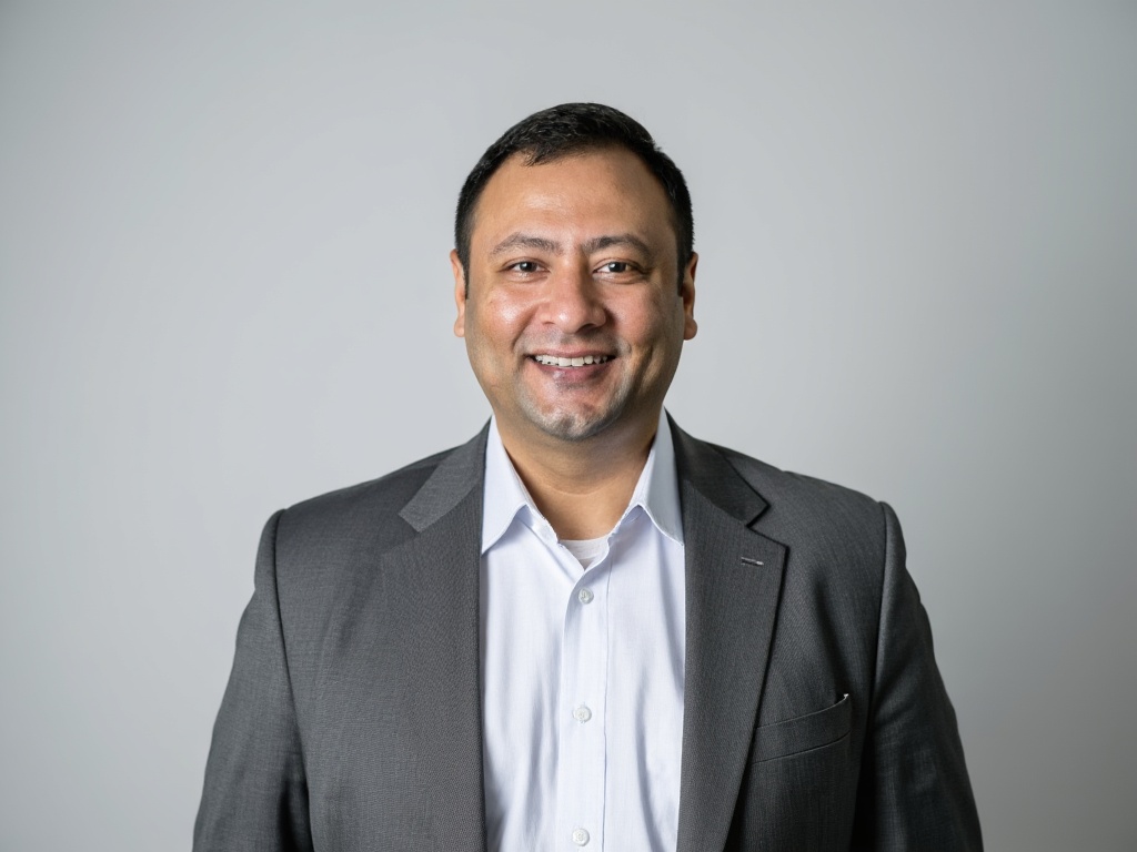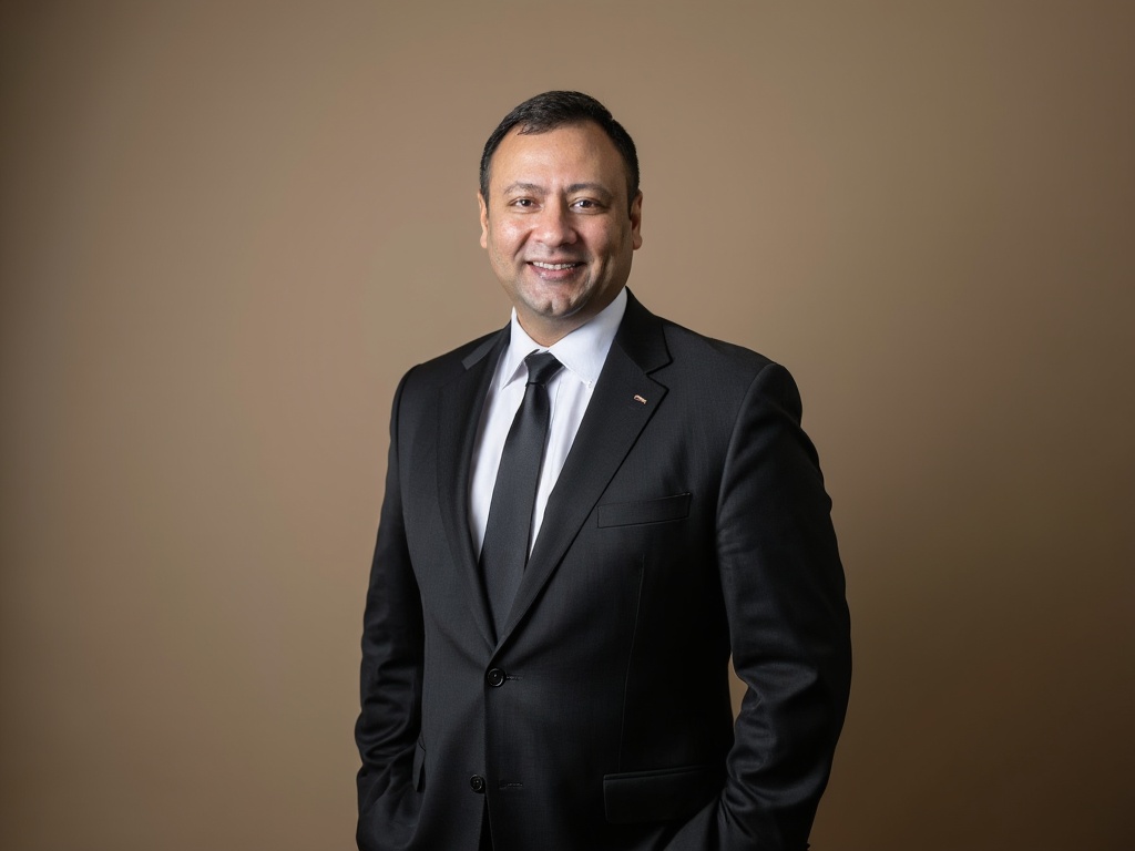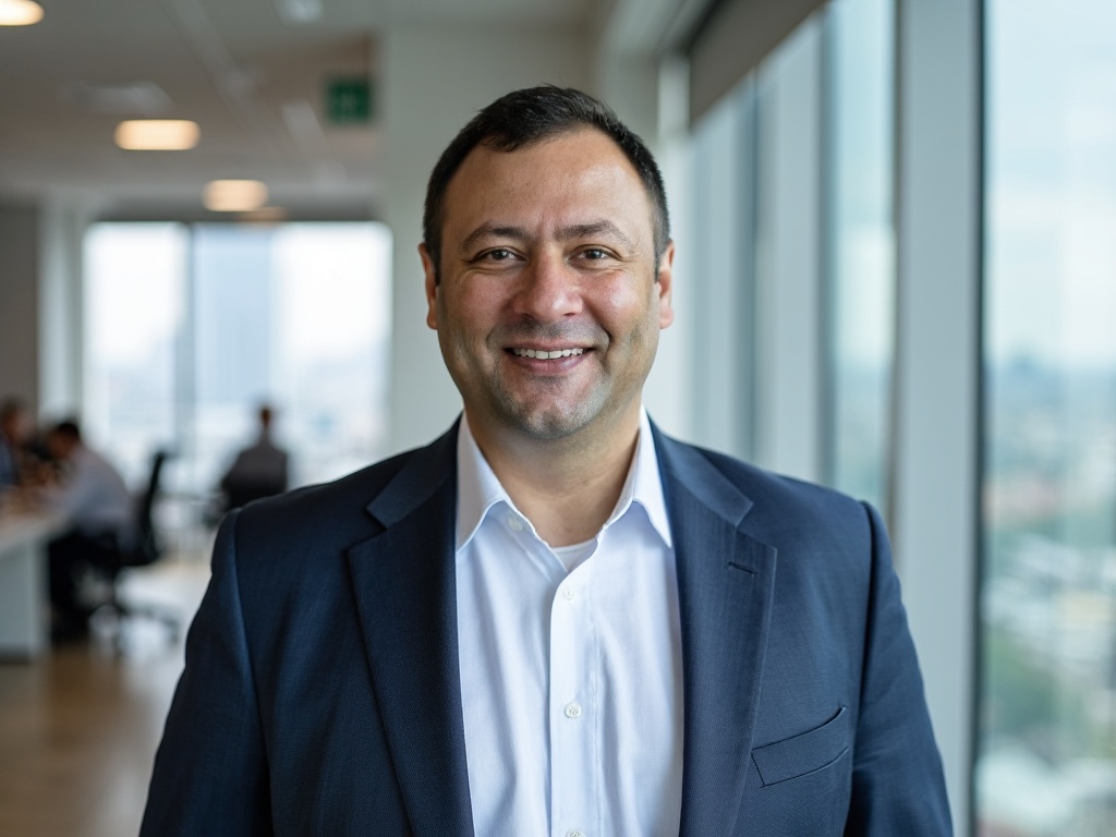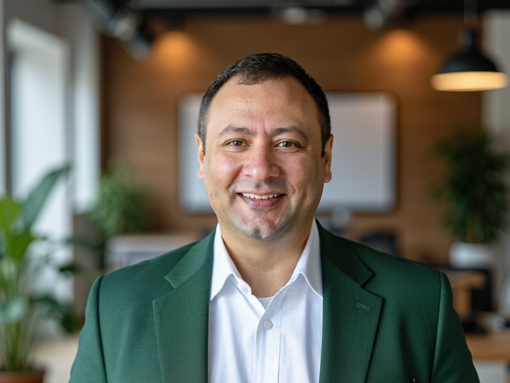 A modern corporate portrait of a man in a dark green suit and white shirt, posed in front of a styli...