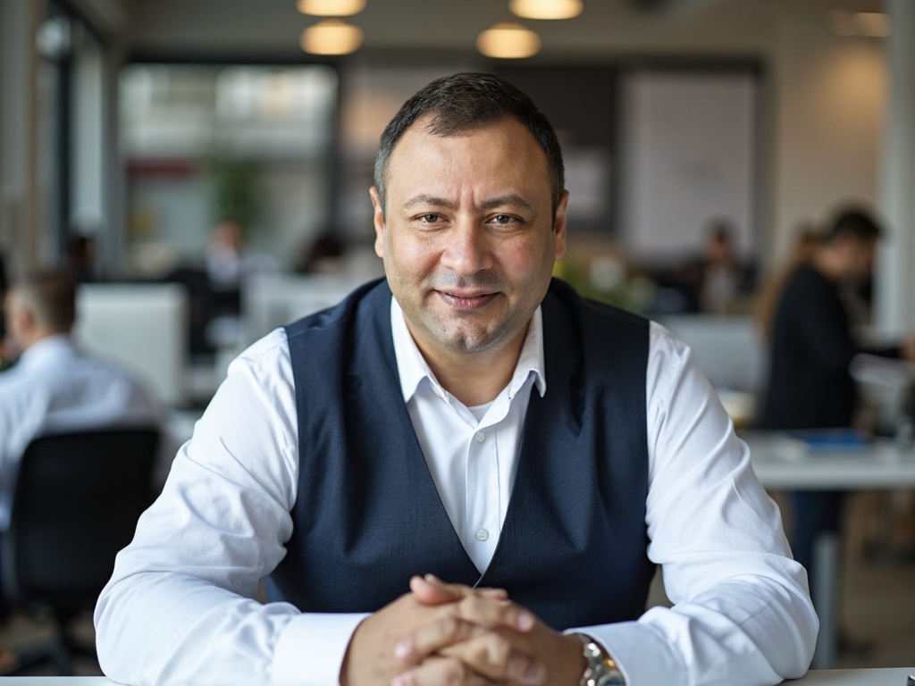A candid-style portrait of a man in a white shirt and navy vest, leaning slightly against a desk in ...