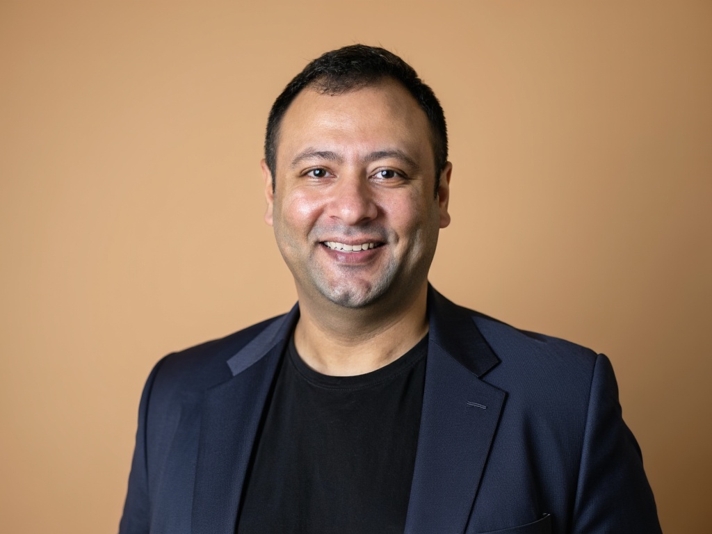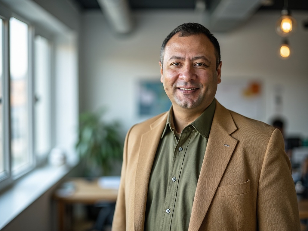 A clean editorial-style headshot of a man in his 40s, wearing a tan blazer and an olive green shirt,...