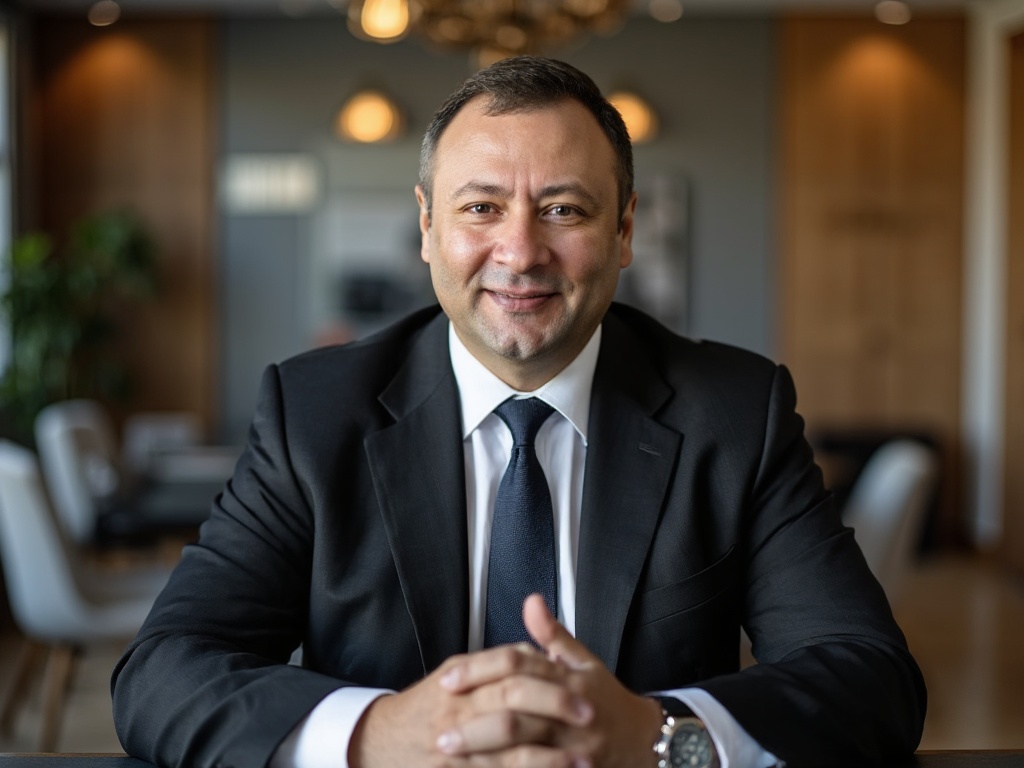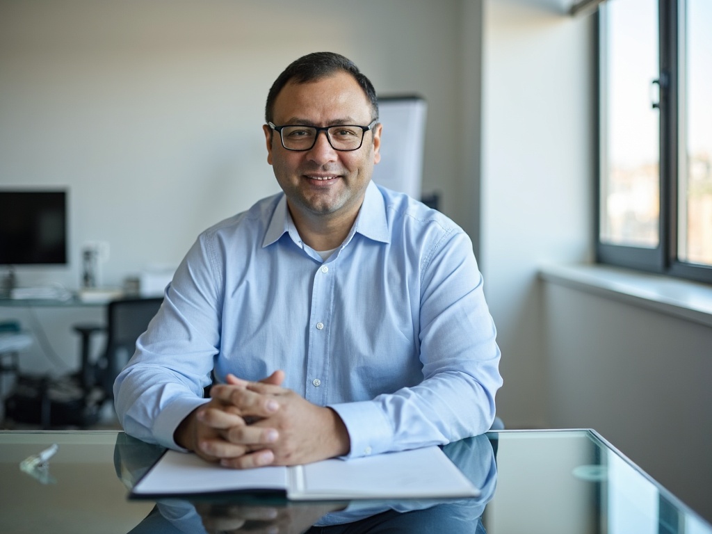 A professional man seated at a glass desk in a contemporary office space, dressed in a light blue dr...