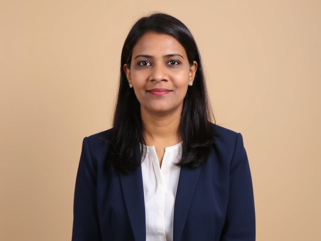 A confident Indian woman in a tailored navy blue blazer over a white blouse, standing against a neut...
