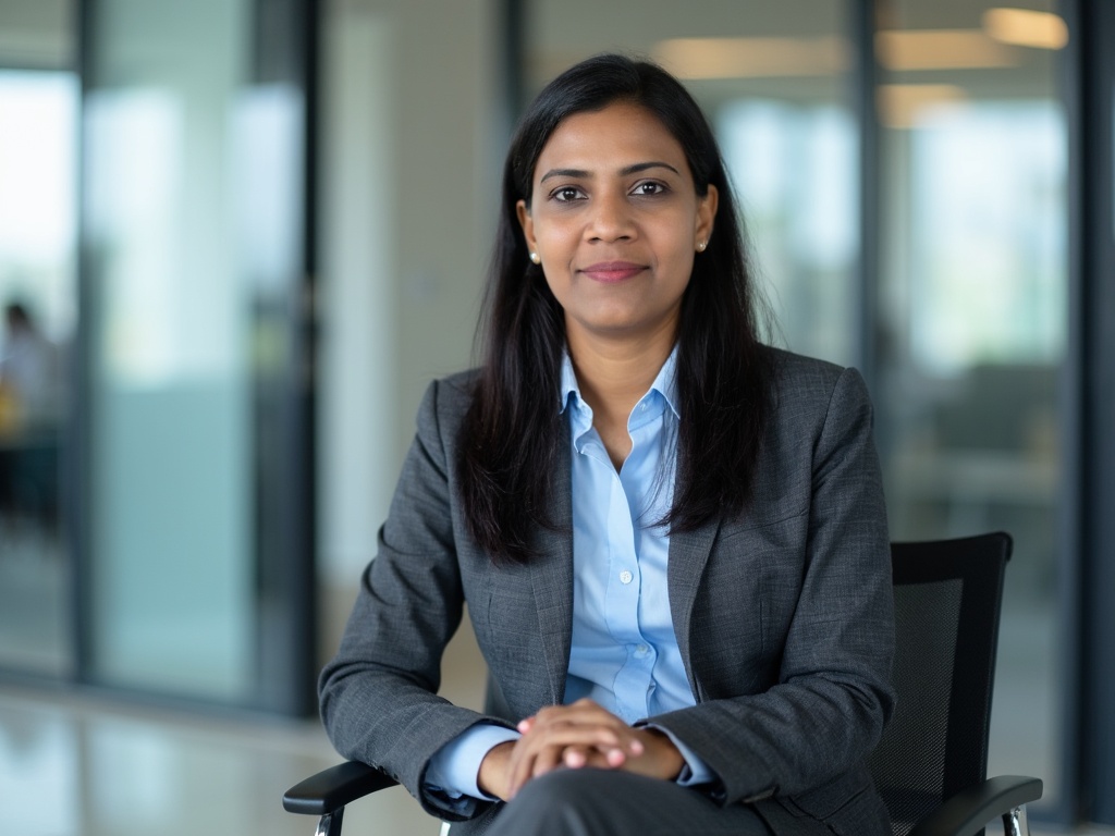 A professional Indian woman in a charcoal gray pant-suit, with a light blue shirt underneath, sittin...