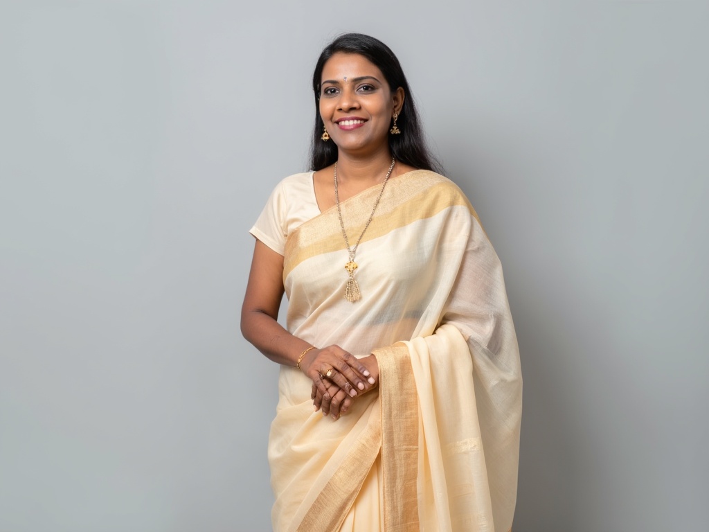 An Indian woman wearing a simple, elegant cotton saree in neutral tones with a matching blouse, stan...