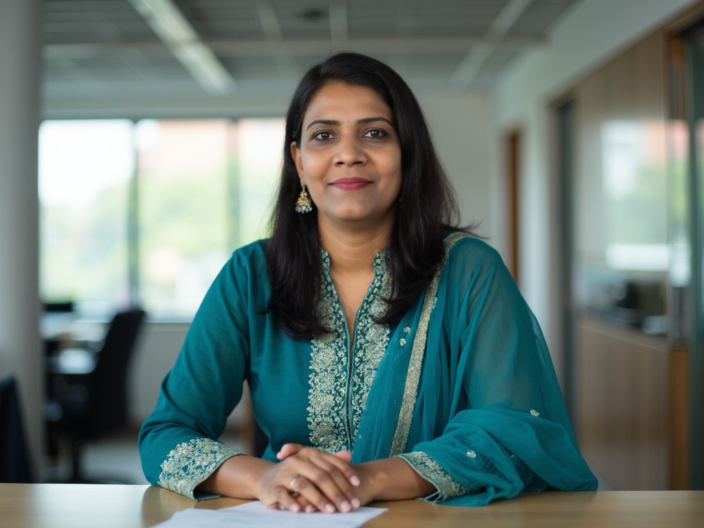 A candid-style portrait of an Indian woman in a teal-colored formal salwar suit with a dupatta neatl...