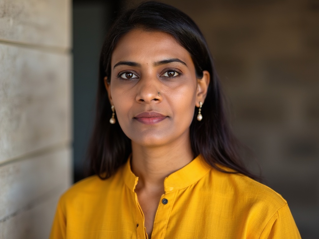 A close-up portrait of an Indian woman in a mustard yellow formal kurti with structured collars, sta...