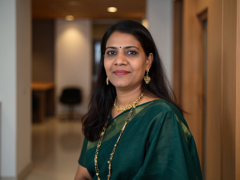 A modern corporate headshot of an Indian woman in a dark green saree with minimalistic gold jewelry,...