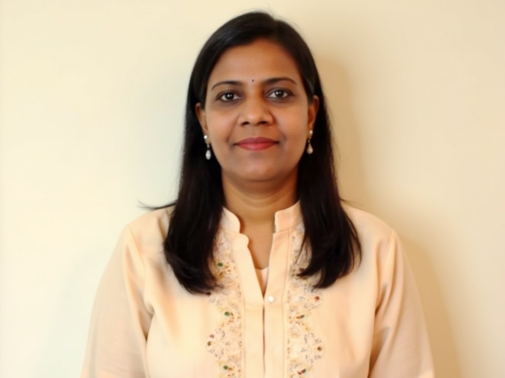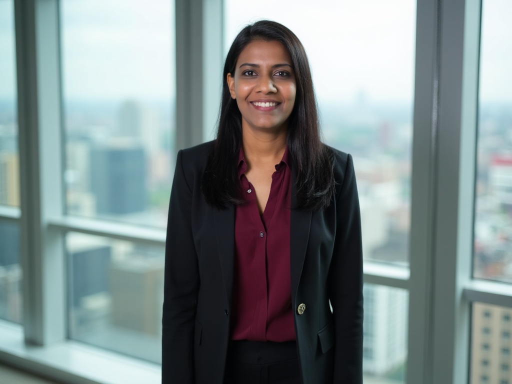 A professional Indian woman in a fitted black blazer and maroon top, standing in front of large wind...
