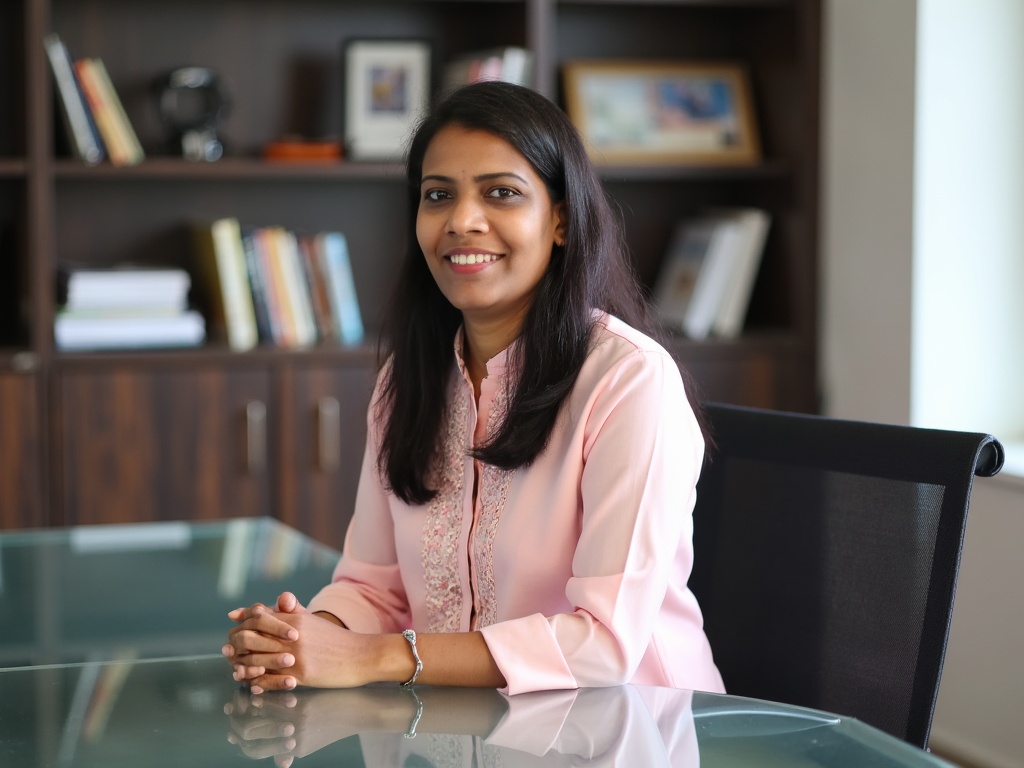 An Indian businesswoman seated at a sleek glass desk, wearing a pale pink chikankari kurta with form...