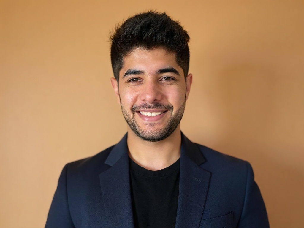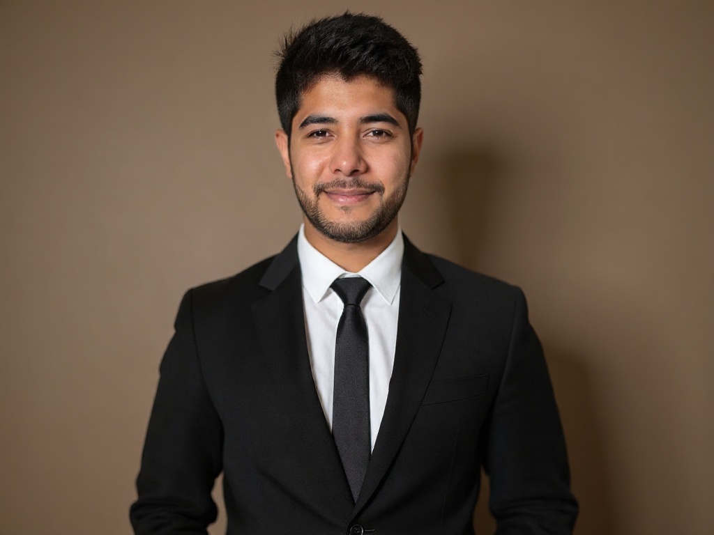 A sharply dressed man in a black suit and tie, standing confidently against a solid taupe background...