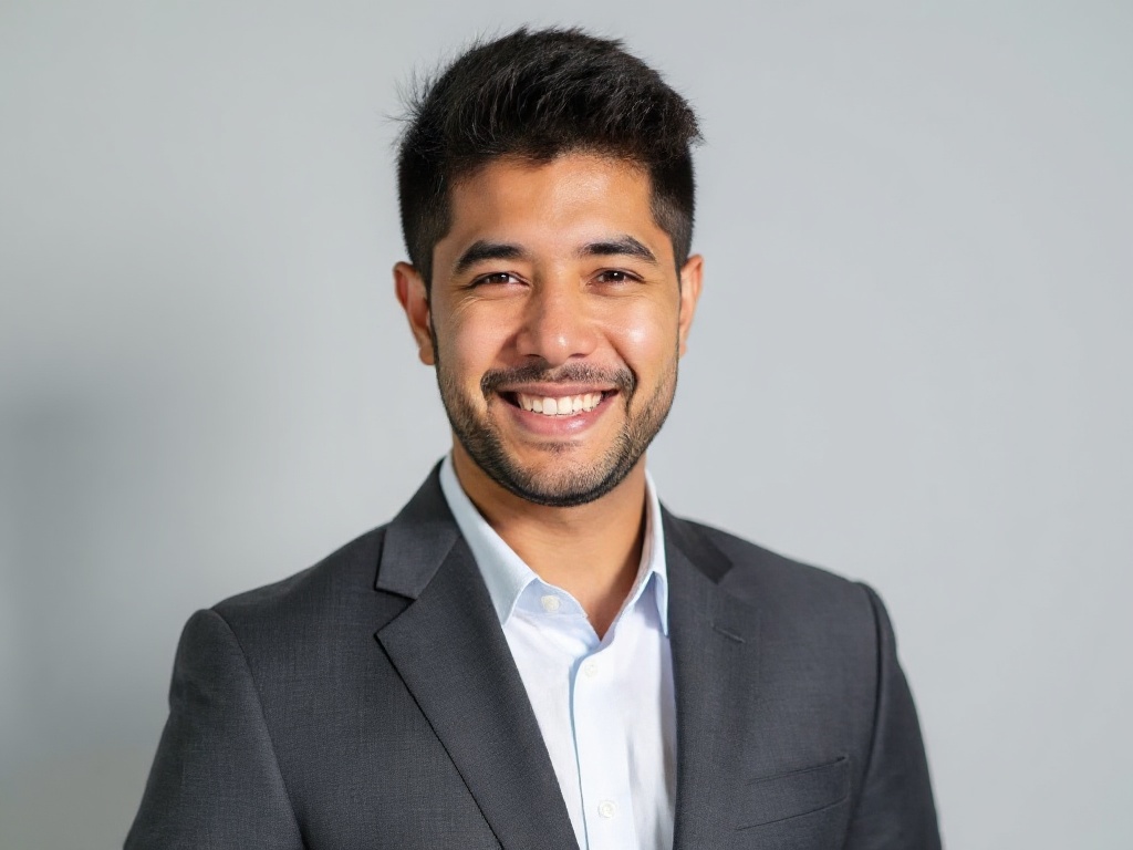 A professional headshot of a confident man in a charcoal gray suit and crisp white shirt, no tie, st...