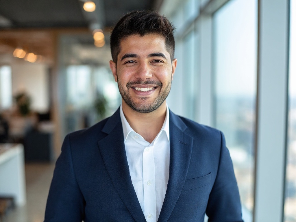 A well-groomed man in a fitted navy blue suit and white dress shirt, standing in front of a floor-to...