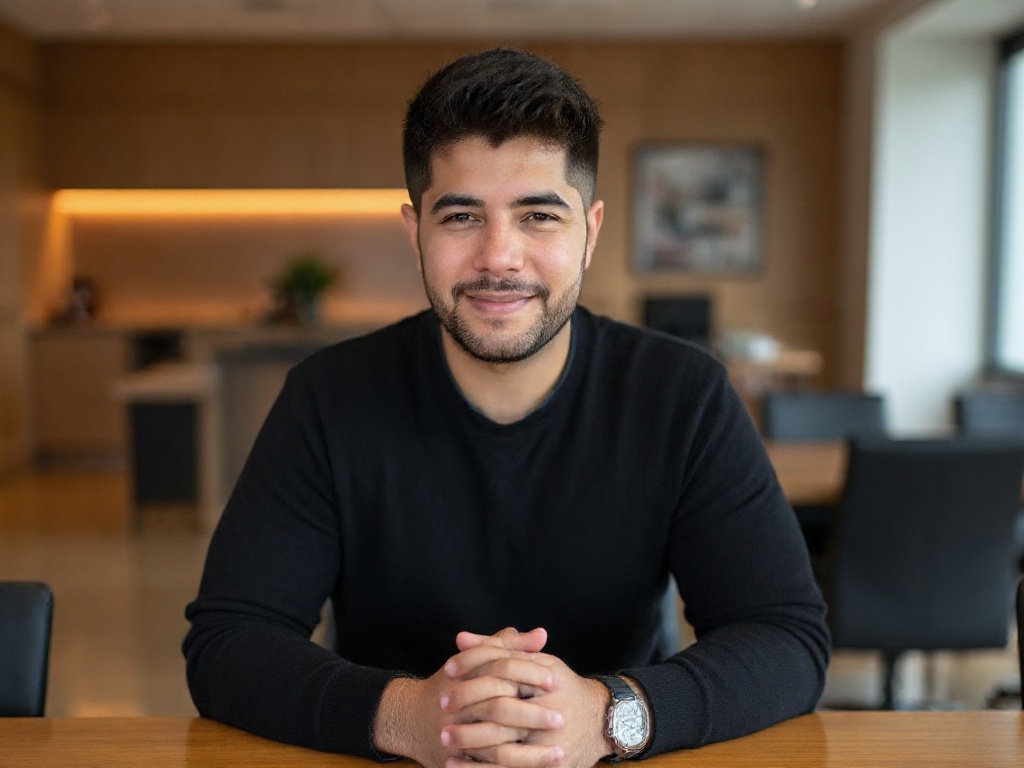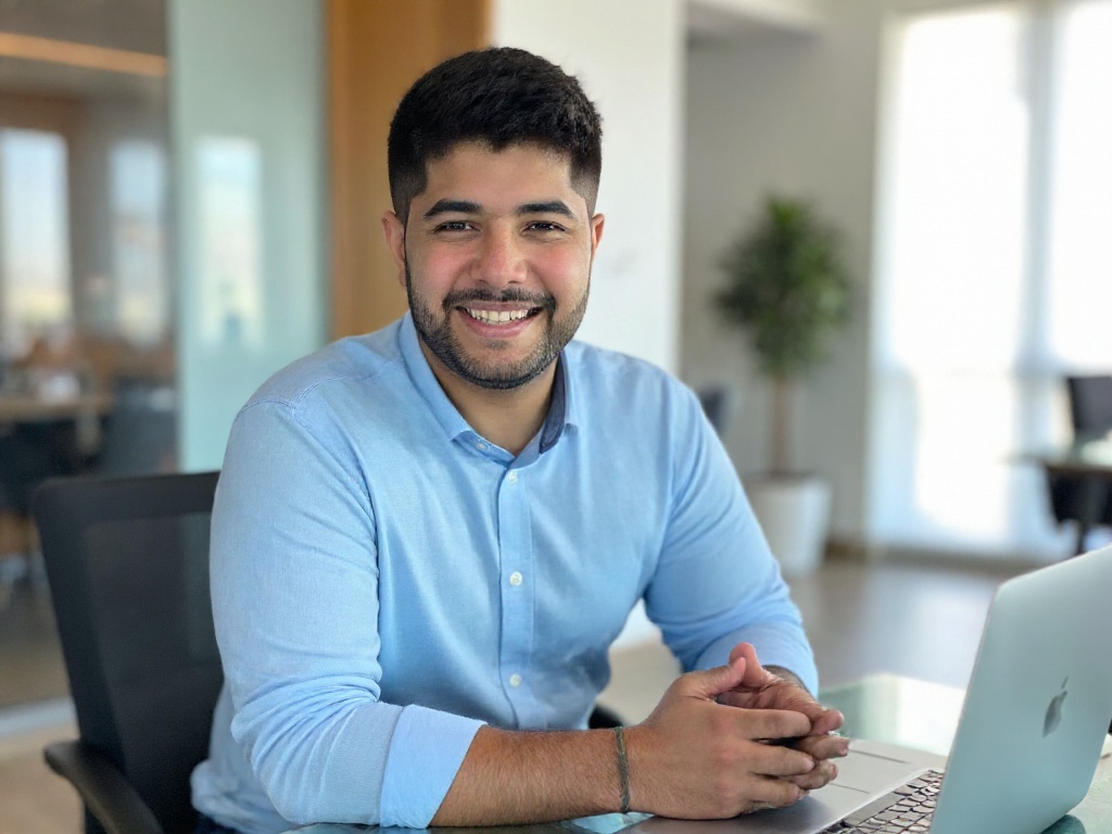A professional man seated at a glass desk in a contemporary office space, dressed in a light blue dr...