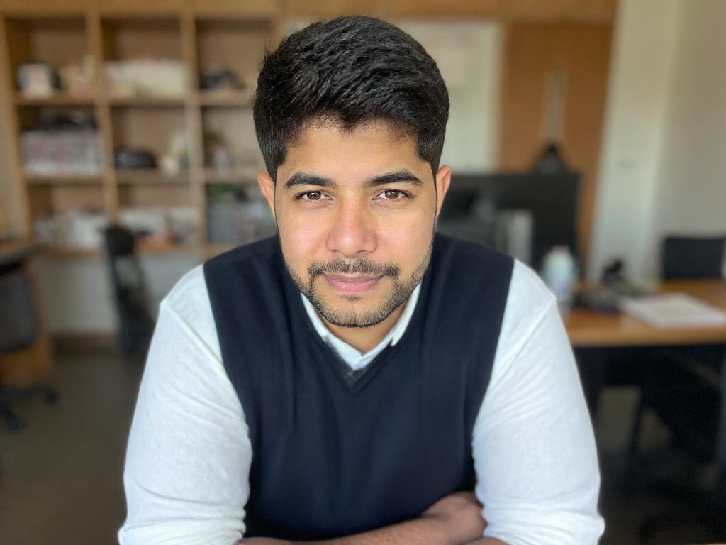 A candid-style portrait of a man in a white shirt and navy vest, leaning slightly against a desk in ...