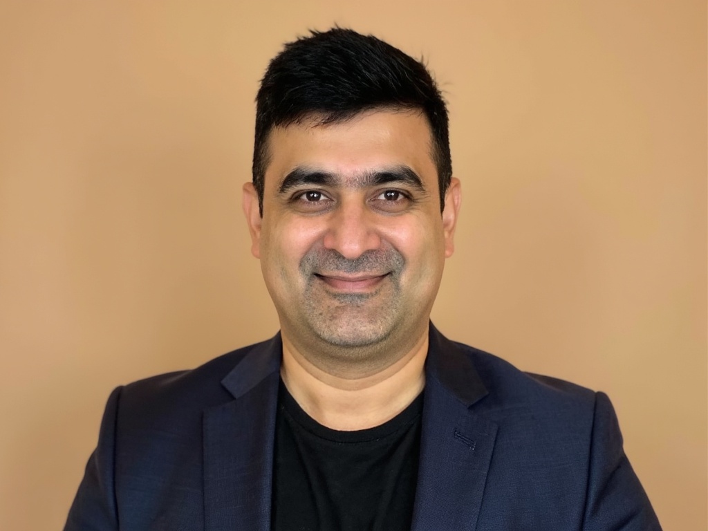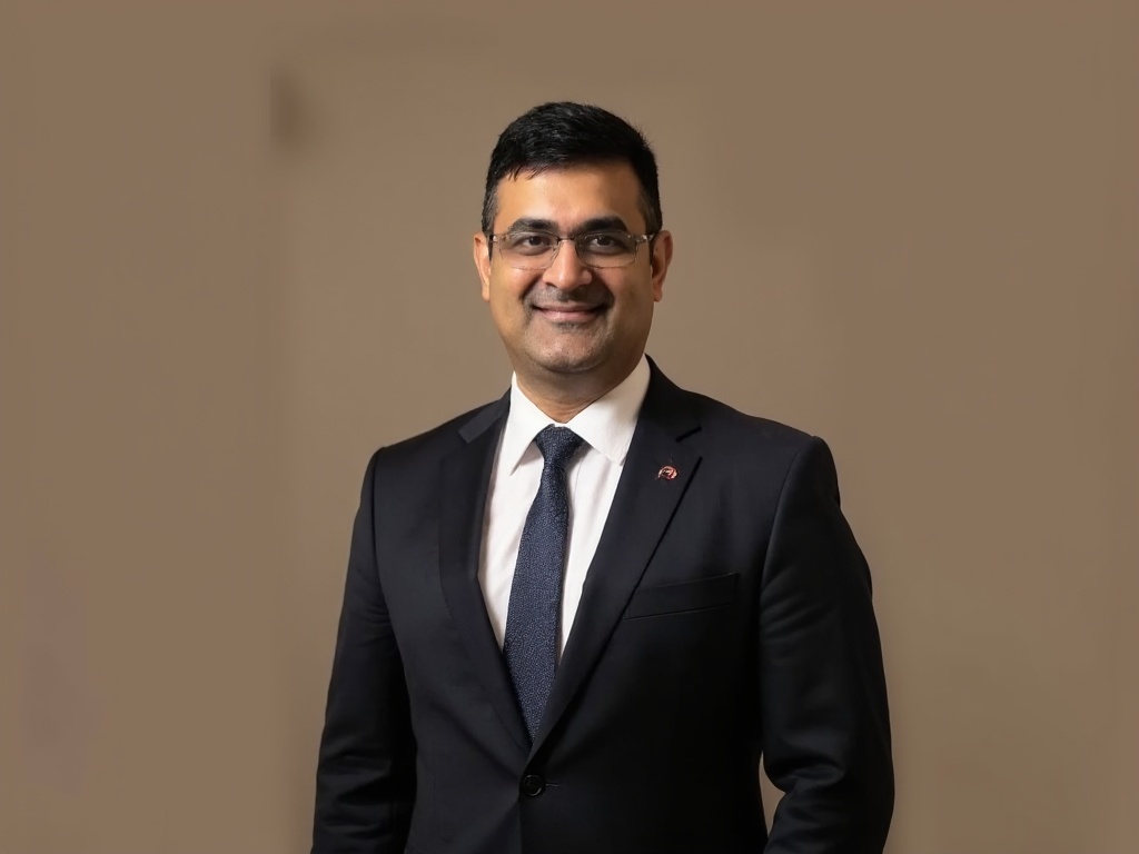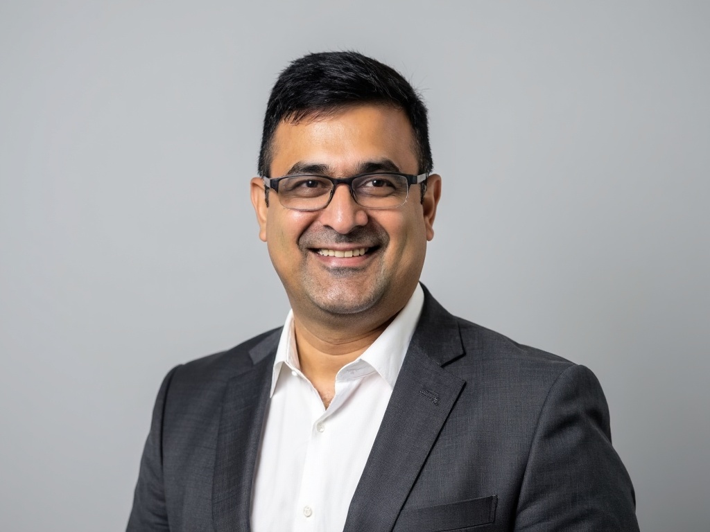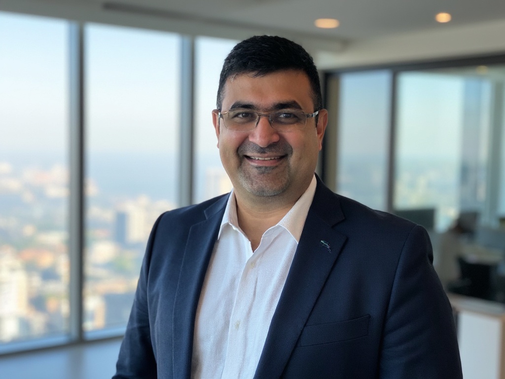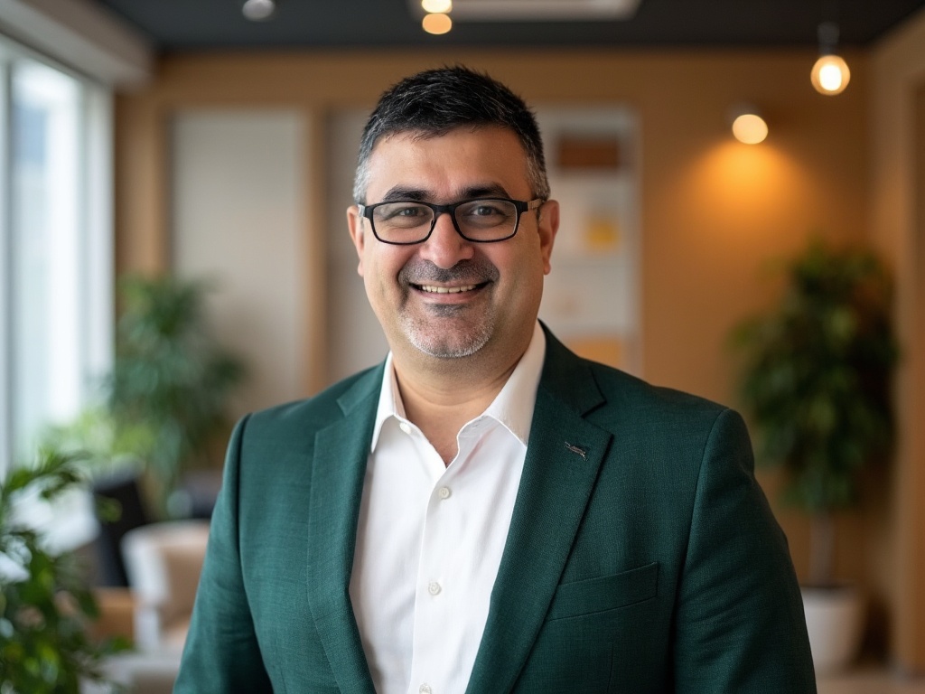 A modern corporate portrait of a man in a dark green suit and white shirt, posed in front of a styli...