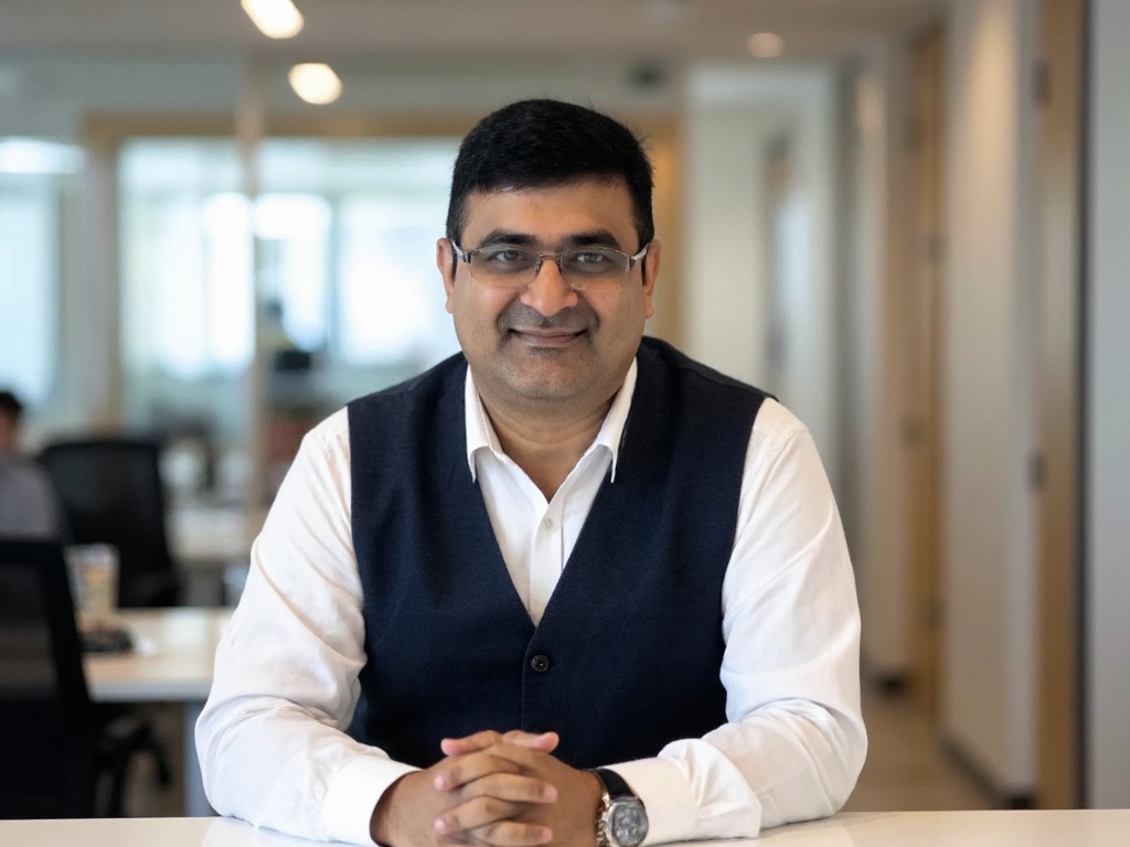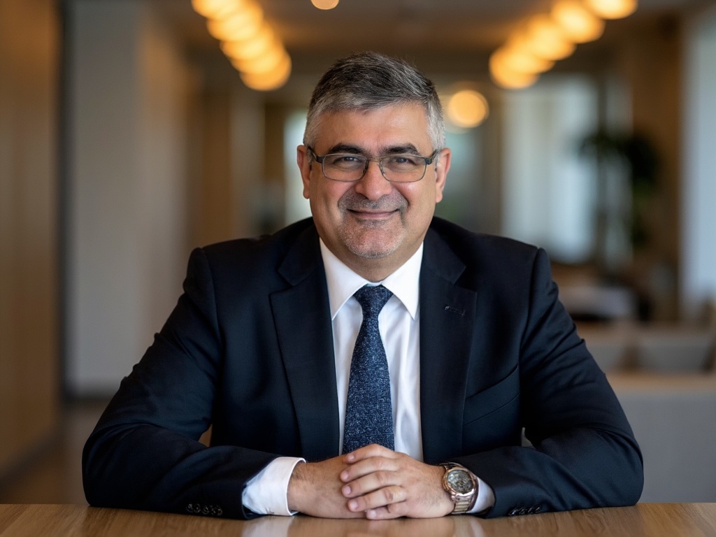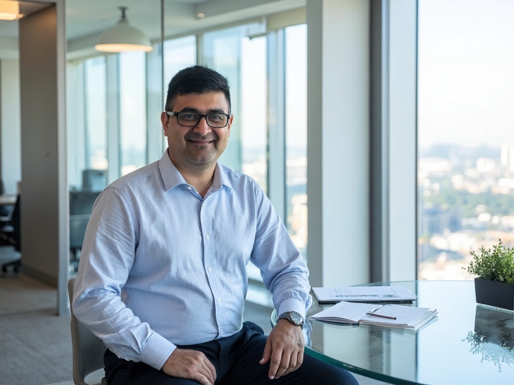A professional man seated at a glass desk in a contemporary office space, dressed in a light blue dr...