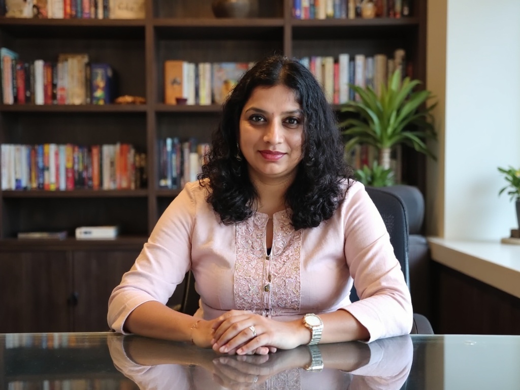 A professional Indian woman in a charcoal gray pant-suit, with a light blue shirt underneath, sittin...