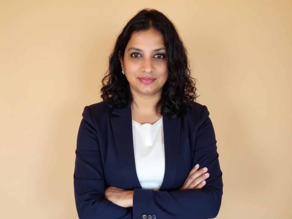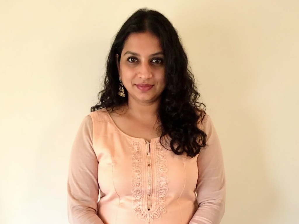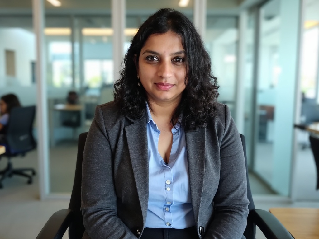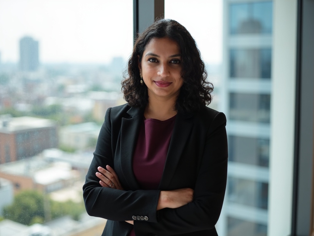 A professional Indian woman in a fitted black blazer and maroon top, standing in front of large wind...