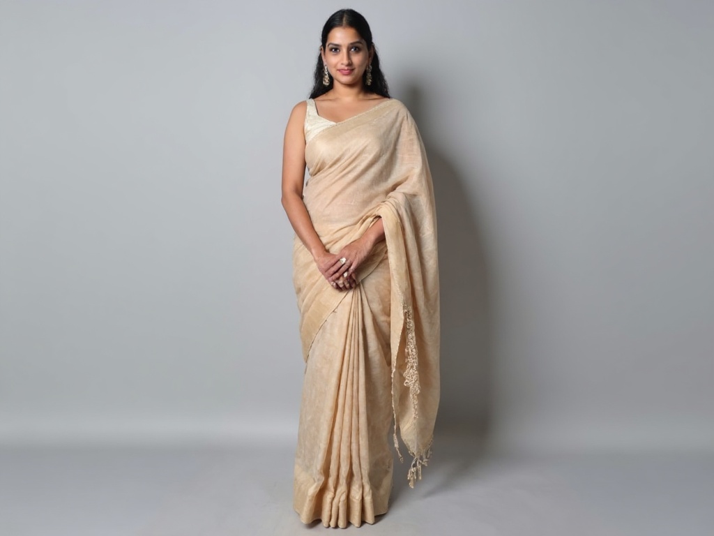 An Indian woman wearing a simple, elegant cotton saree in neutral tones with a matching blouse, stan...