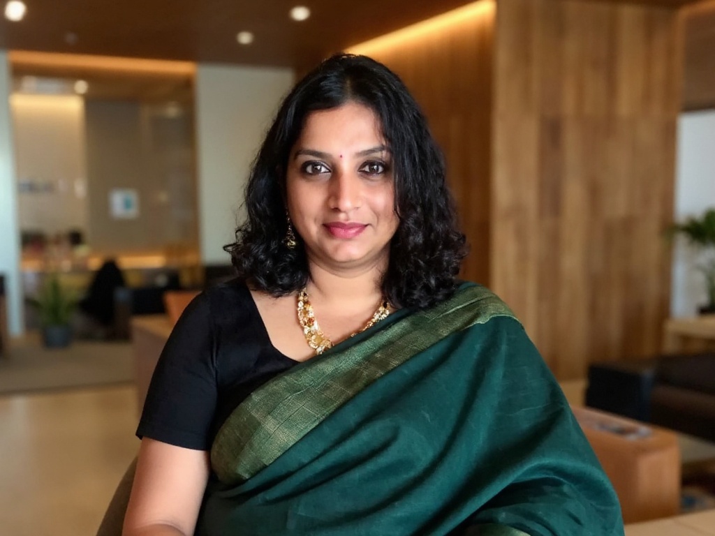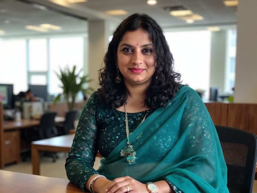 A modern corporate headshot of an Indian woman in a dark green saree with minimalistic gold jewelry,...