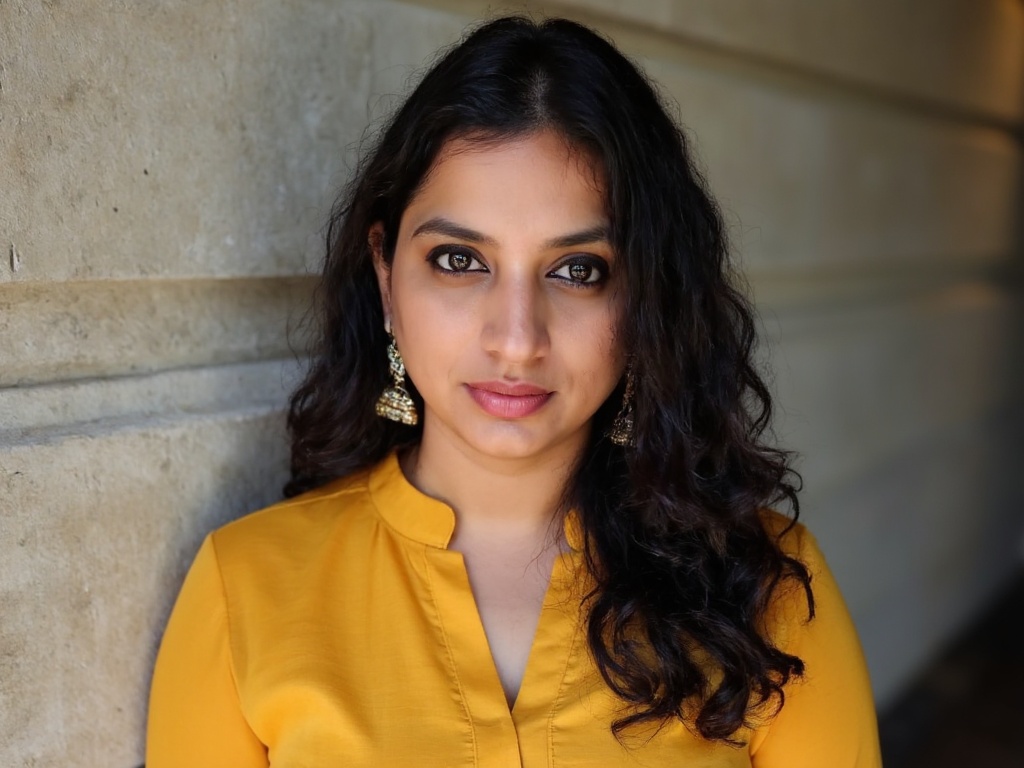 A close-up portrait of an Indian woman in a mustard yellow formal kurti with structured collars, sta...