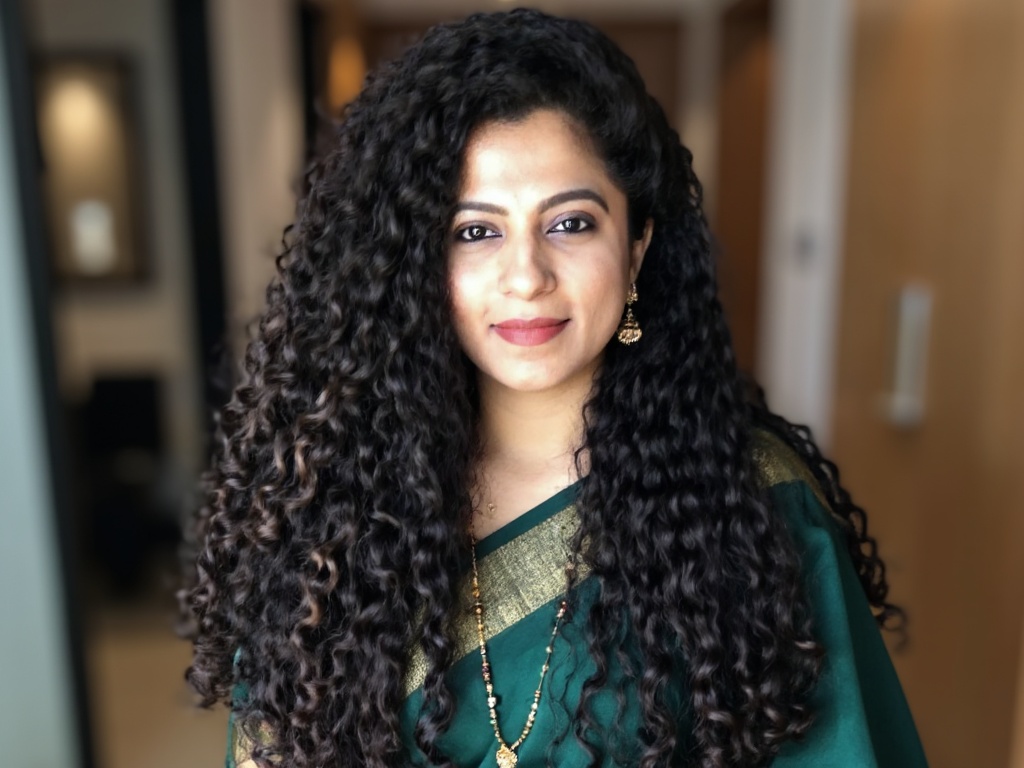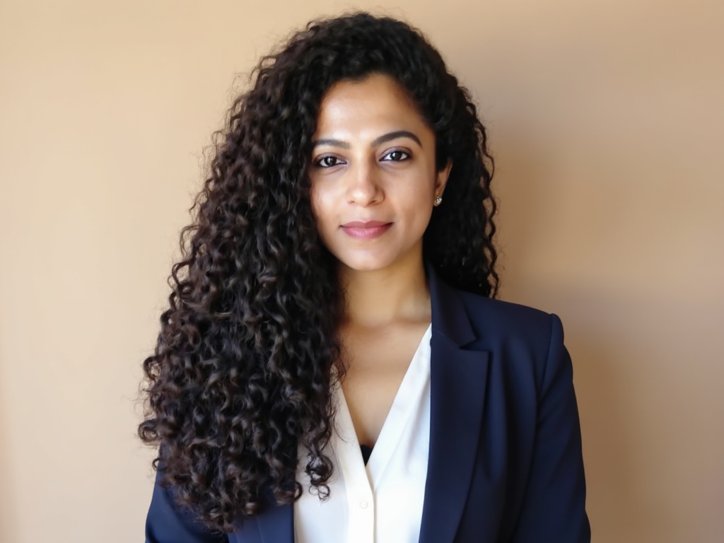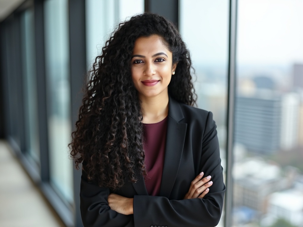 A professional Indian woman in a fitted black blazer and maroon top, standing in front of large wind...