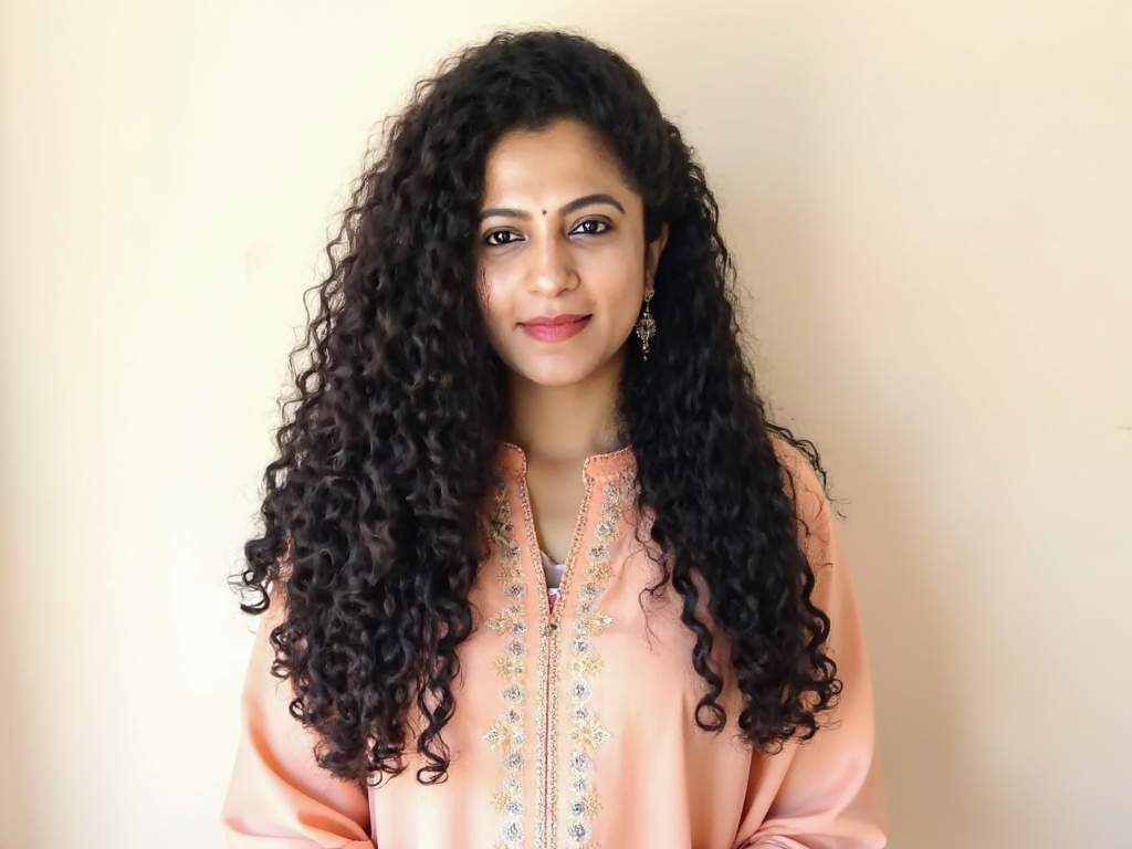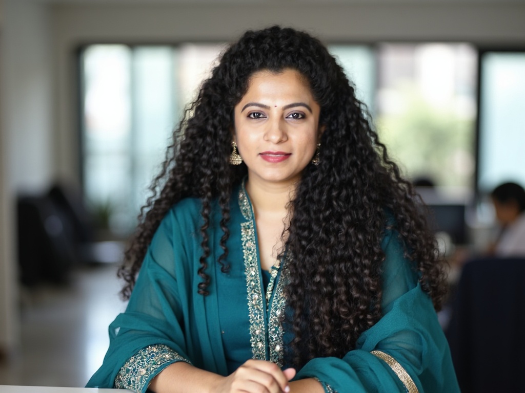 A poised Indian woman in a pastel-colored ethnic kurta with subtle embroidery, paired with minimal j...