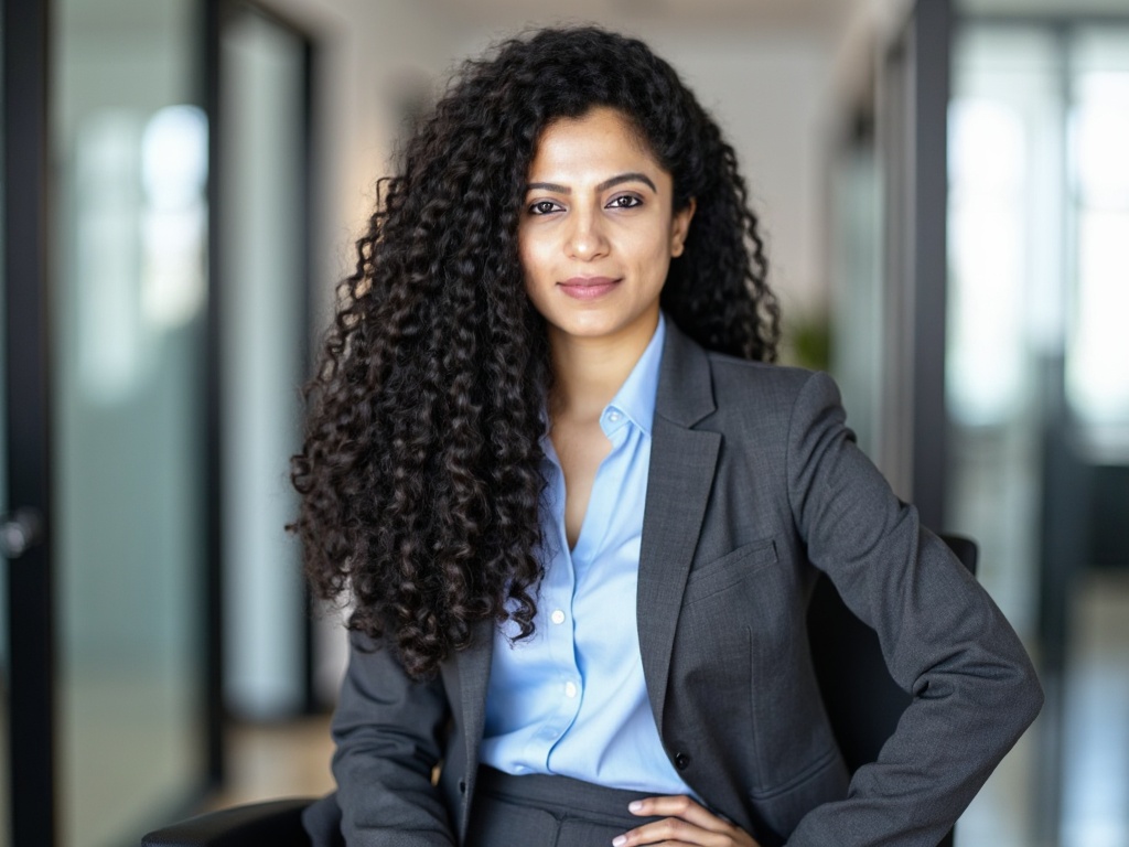 A professional Indian woman in a charcoal gray pant-suit, with a light blue shirt underneath, sittin...