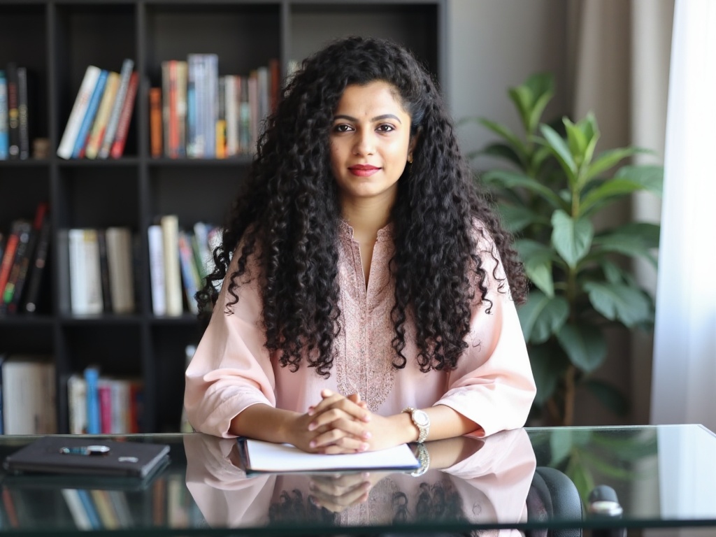 An Indian businesswoman seated at a sleek glass desk, wearing a pale pink chikankari kurta with form...