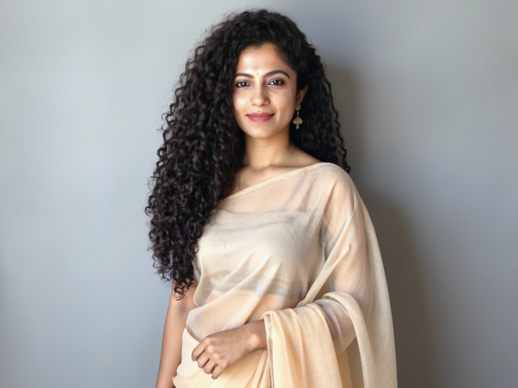 An Indian woman wearing a simple, elegant cotton saree in neutral tones with a matching blouse, stan...