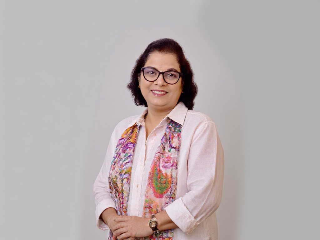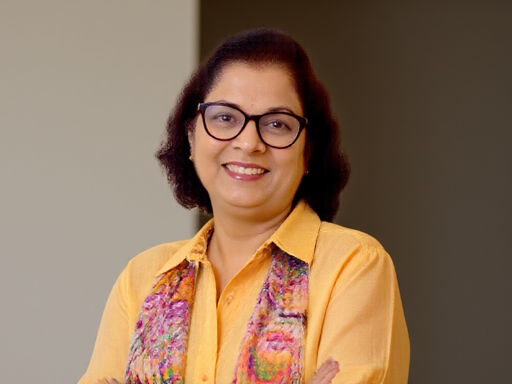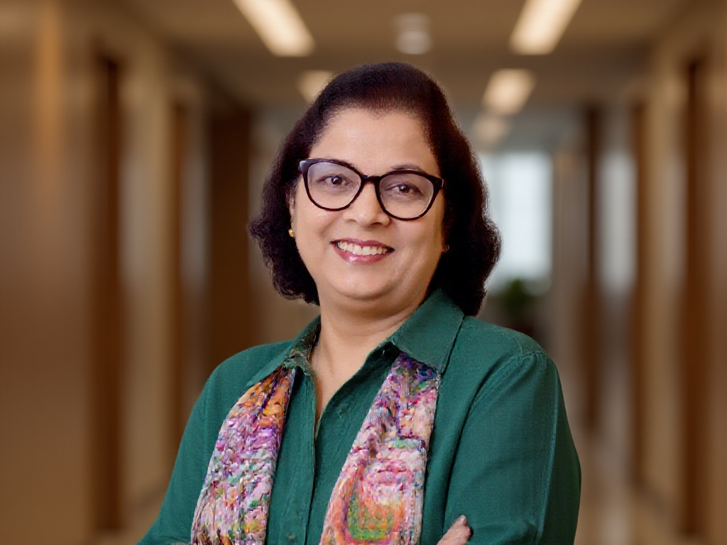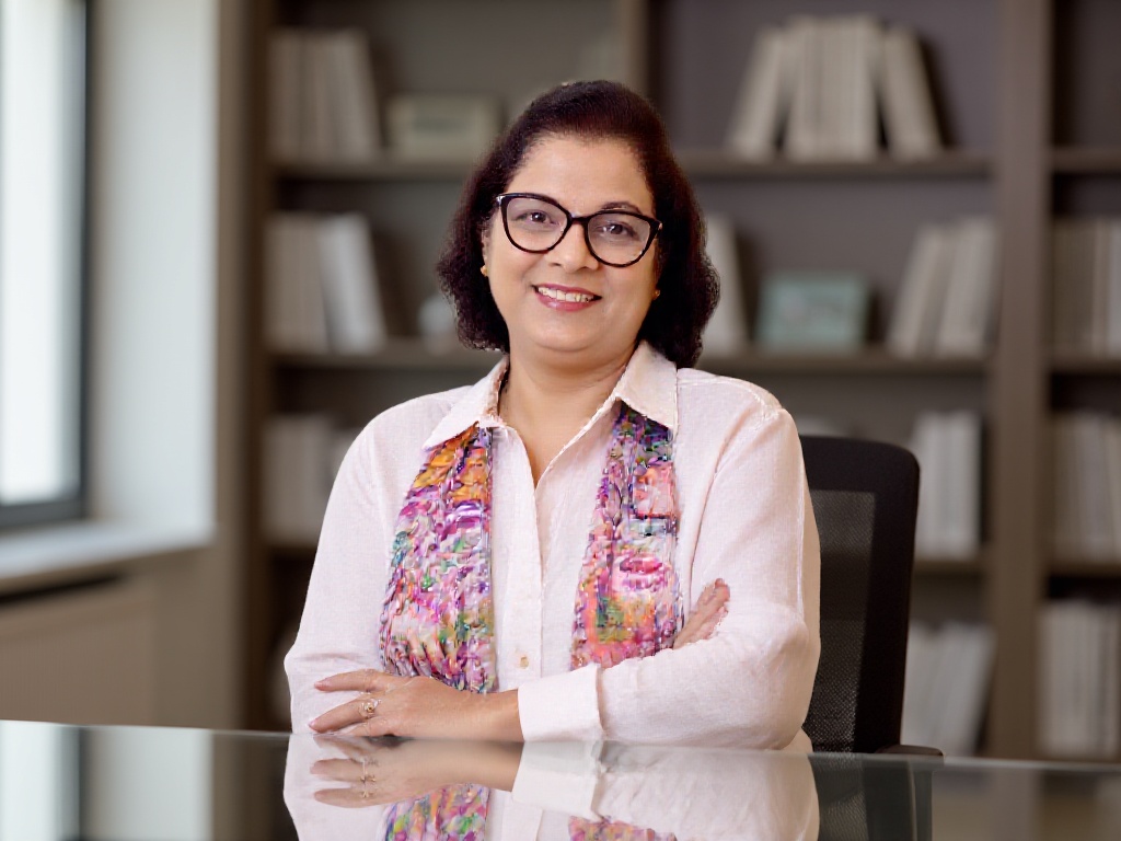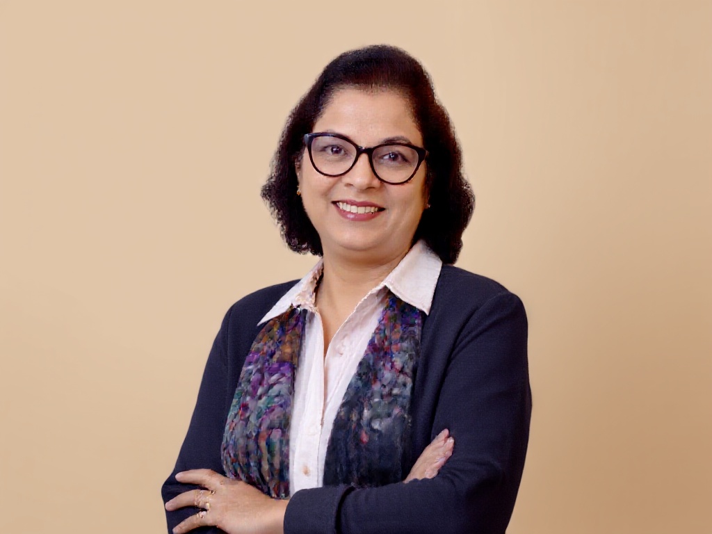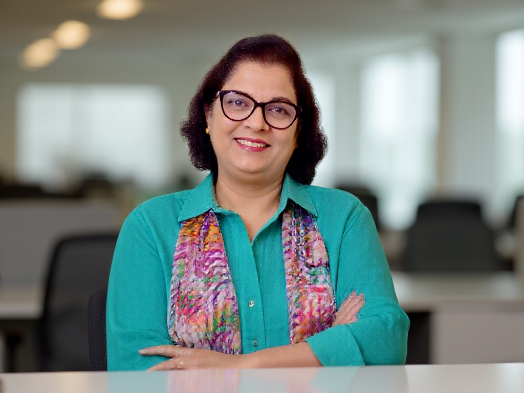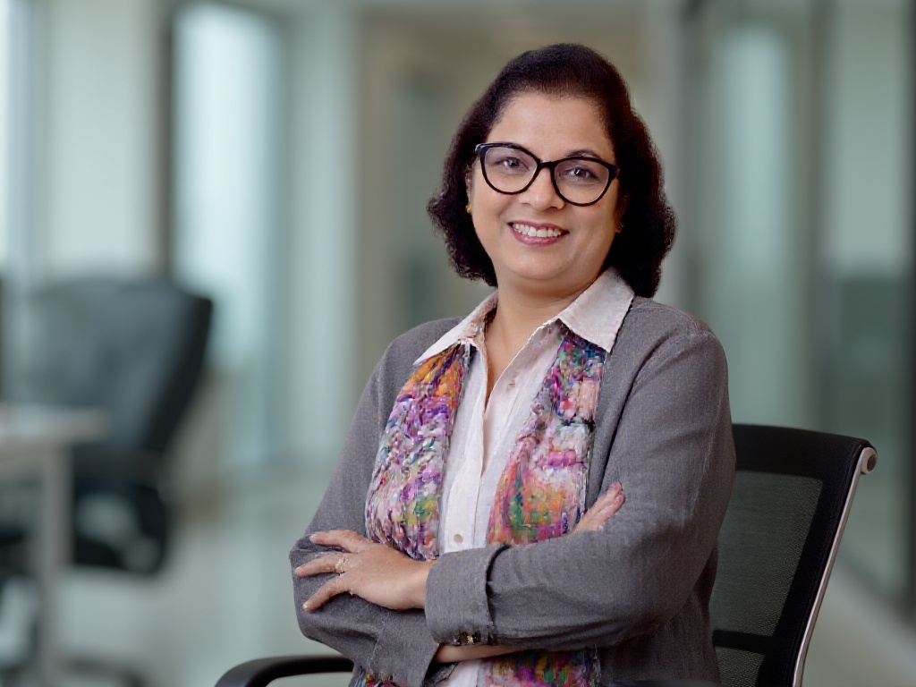 A professional Indian woman in a fitted black blazer and maroon top, standing in front of large wind...