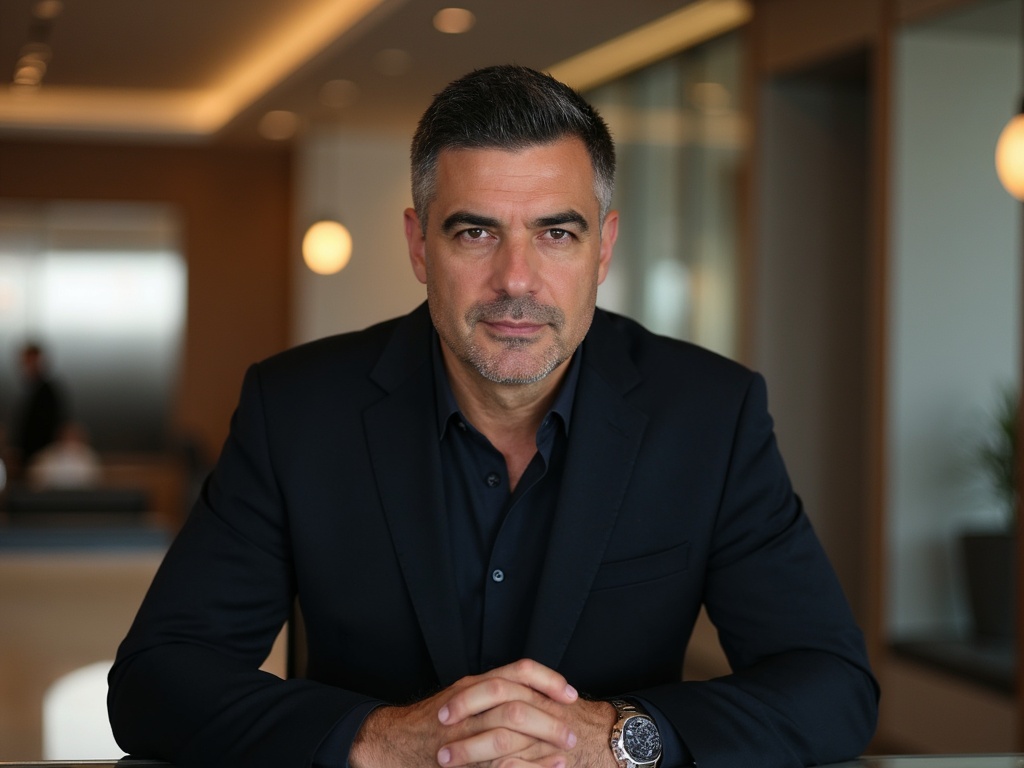 A male executive in a classic black suit, seated with one arm resting on a conference table, looking...
