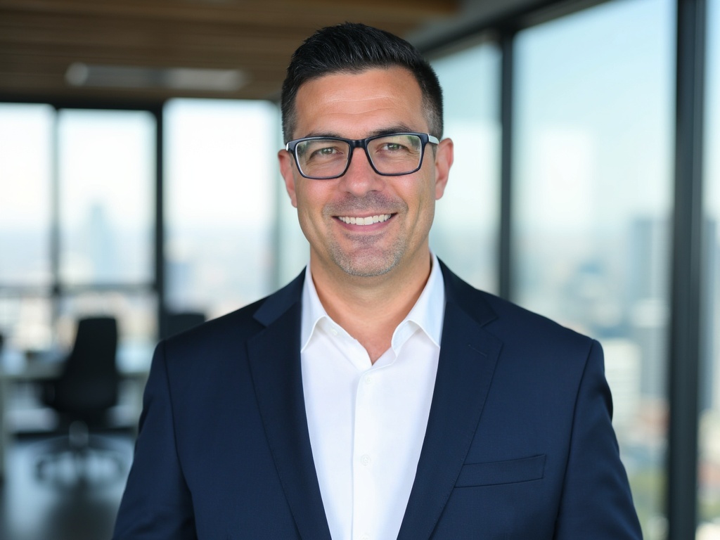 A well-groomed man in a fitted navy blue suit and white dress shirt, standing in front of a floor-to...
