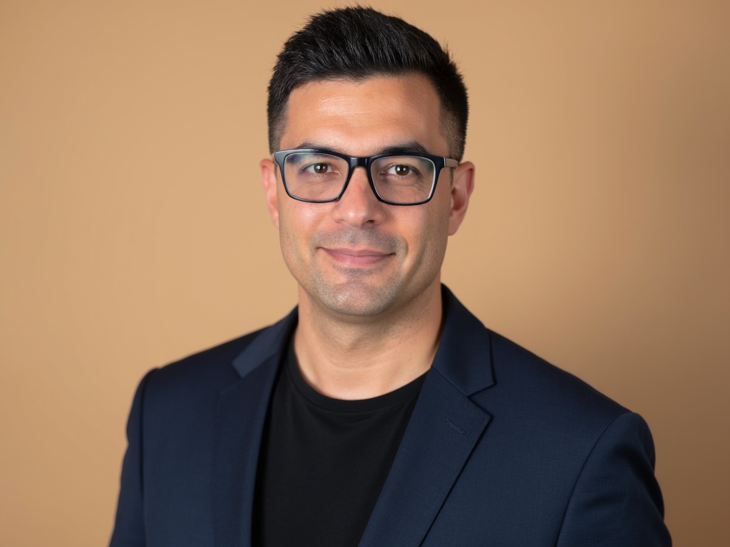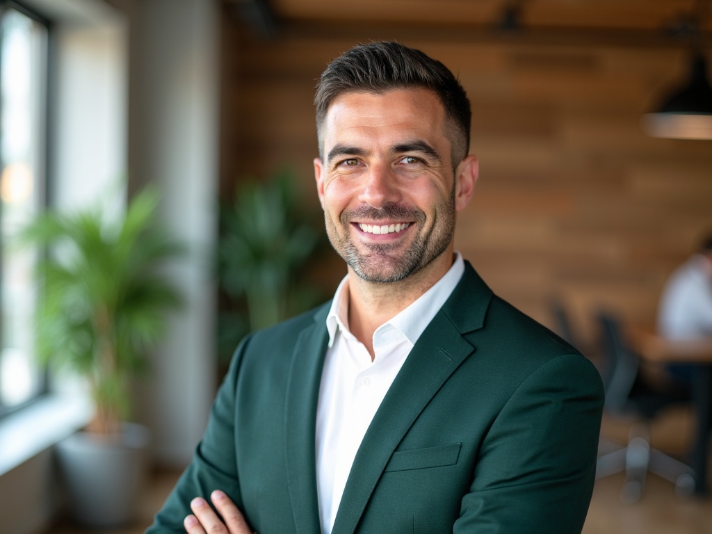 A modern corporate portrait of a man in a dark green suit and white shirt, posed in front of a styli...
