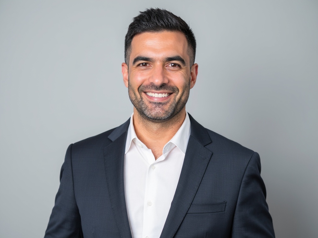 A professional headshot of a confident man in a charcoal gray suit and crisp white shirt, no tie, st...