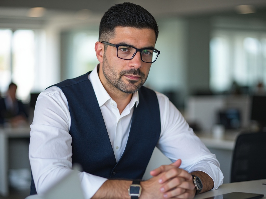 A candid-style portrait of a man in a white shirt and navy vest, leaning slightly against a desk in ...