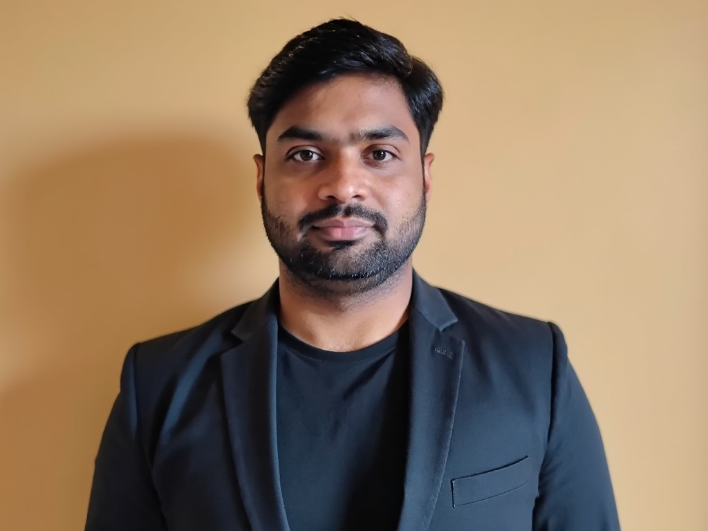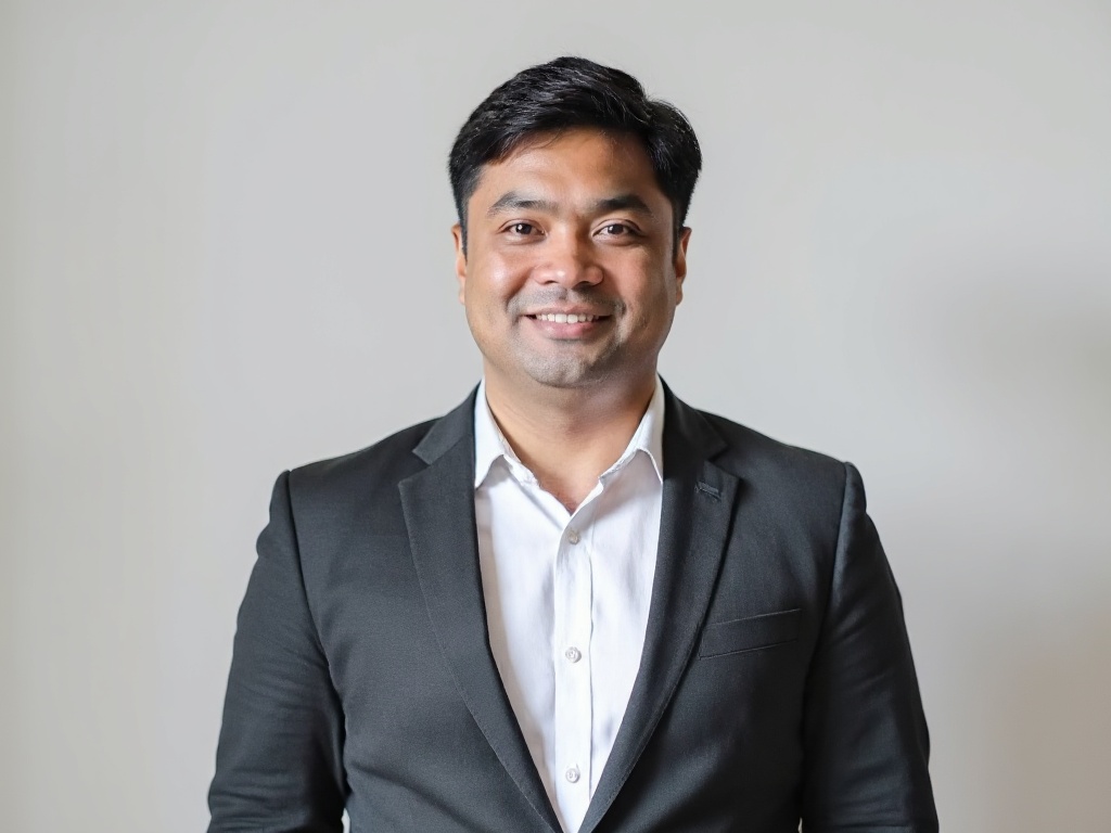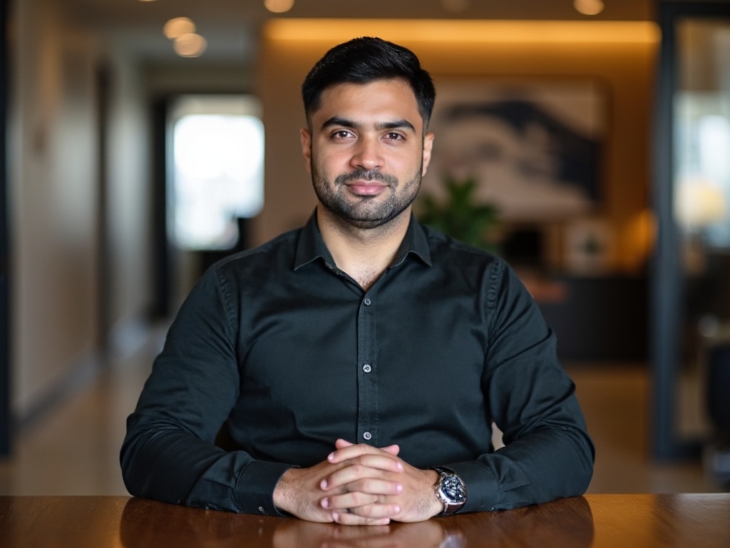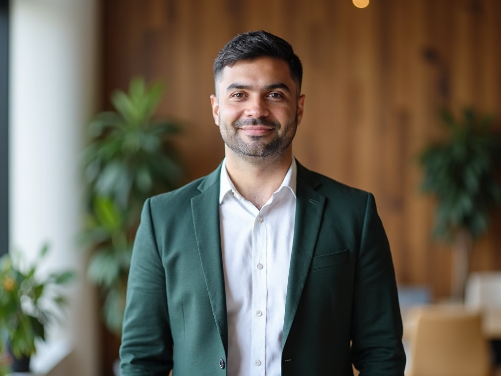 A modern corporate portrait of a man in a dark green suit and white shirt, posed in front of a styli...