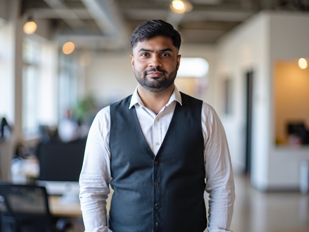 A candid-style portrait of a man in a white shirt and navy vest, leaning slightly against a desk in ...