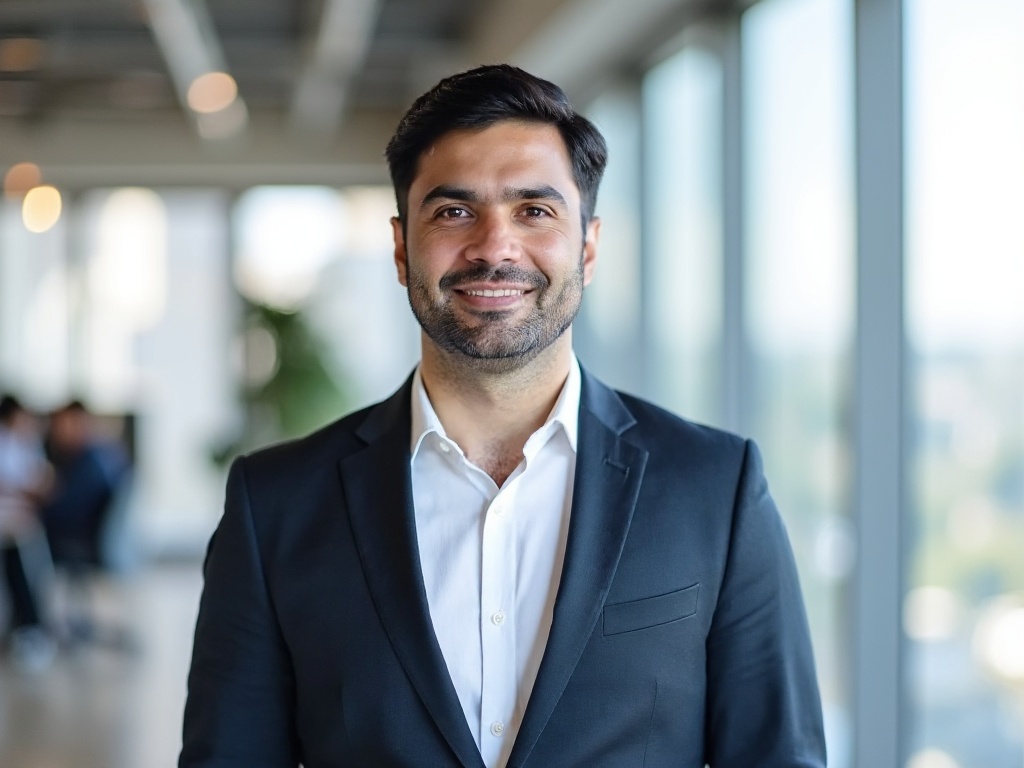 A well-groomed man in a fitted navy blue suit and white dress shirt, standing in front of a floor-to...
