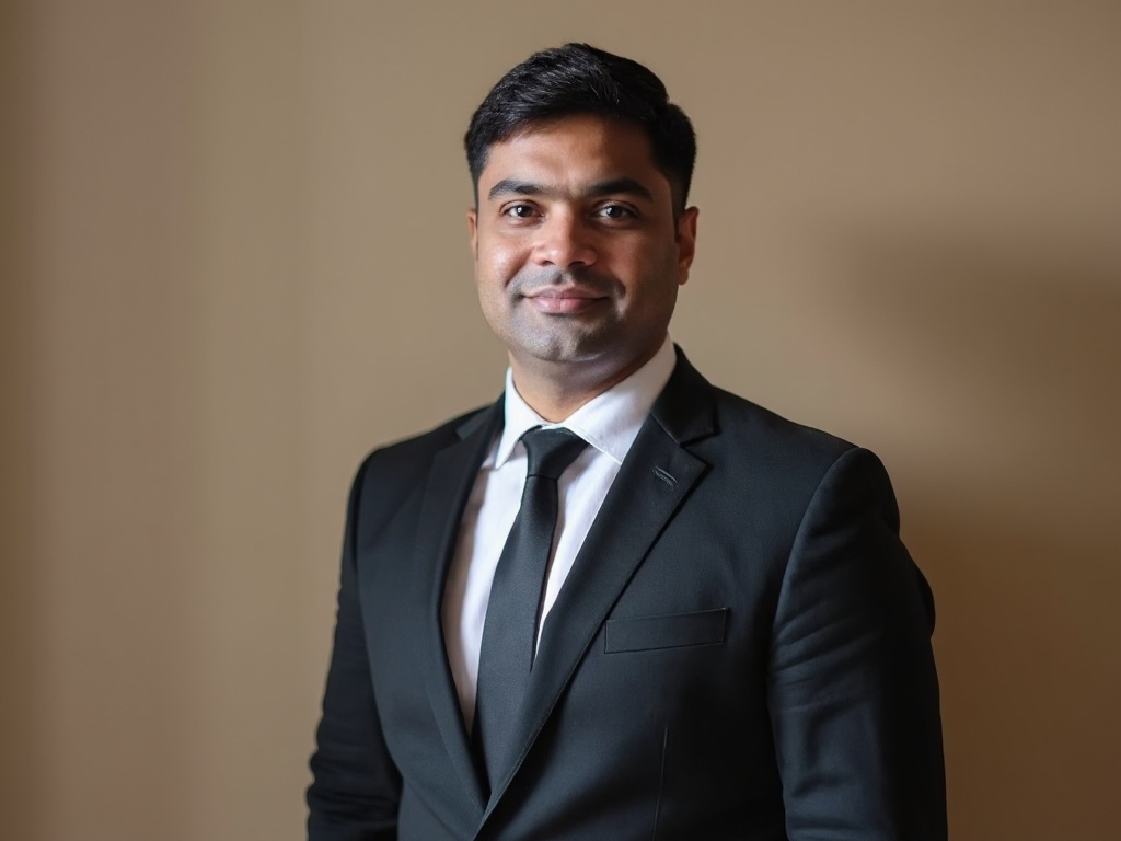A sharply dressed man in a black suit and tie, standing confidently against a solid taupe background...