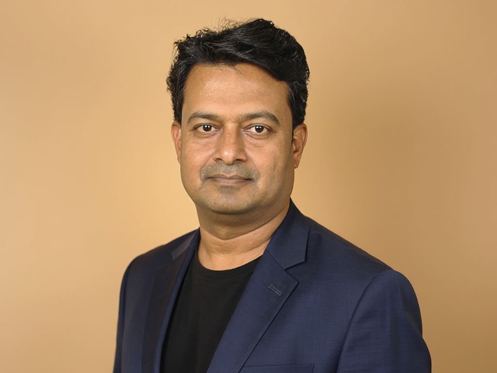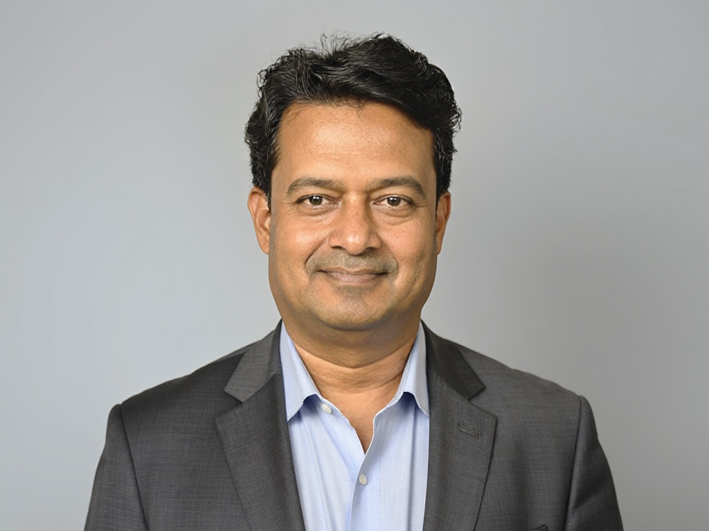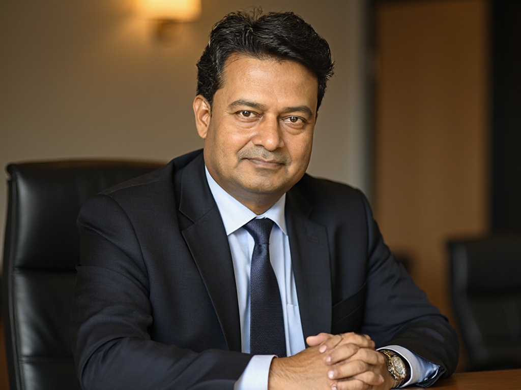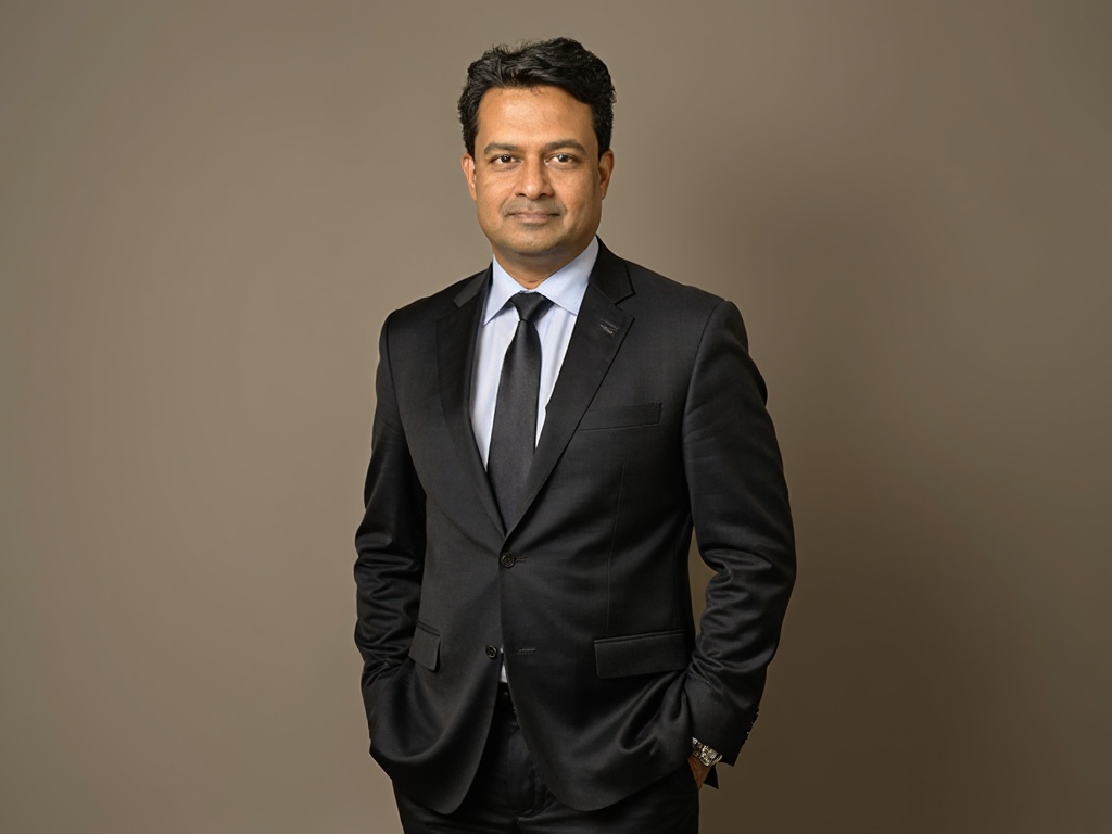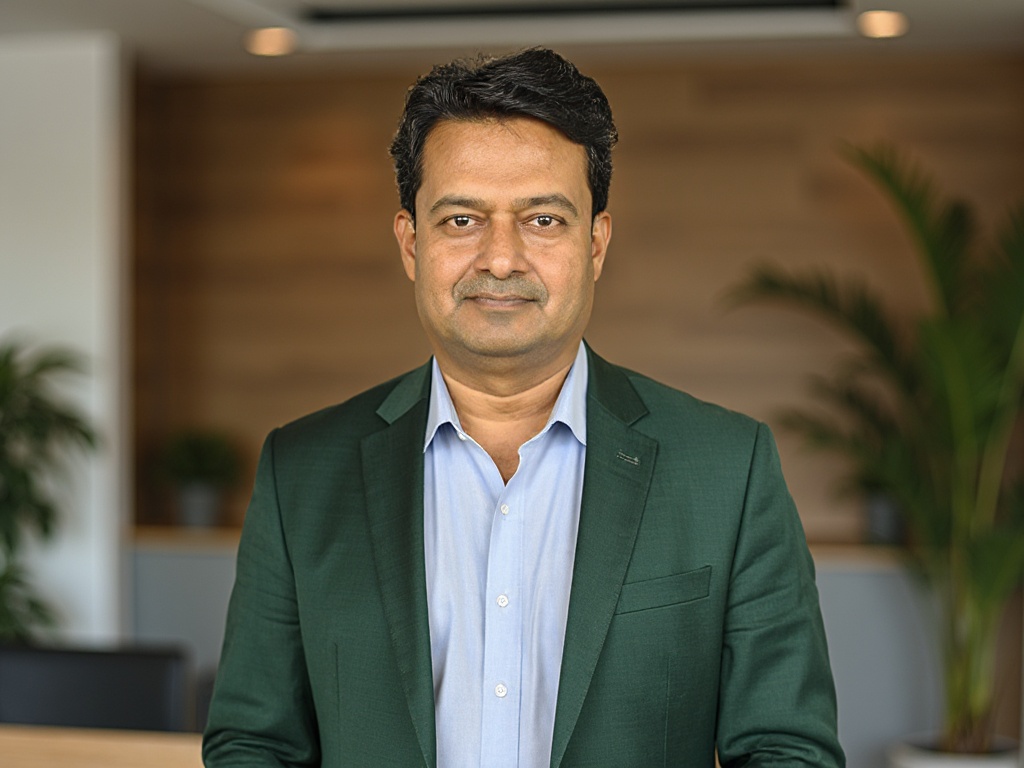A modern corporate portrait of a man in a dark green suit and white shirt, posed in front of a styli...