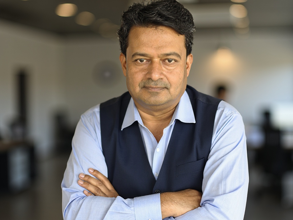 A candid-style portrait of a man in a white shirt and navy vest, leaning slightly against a desk in ...
