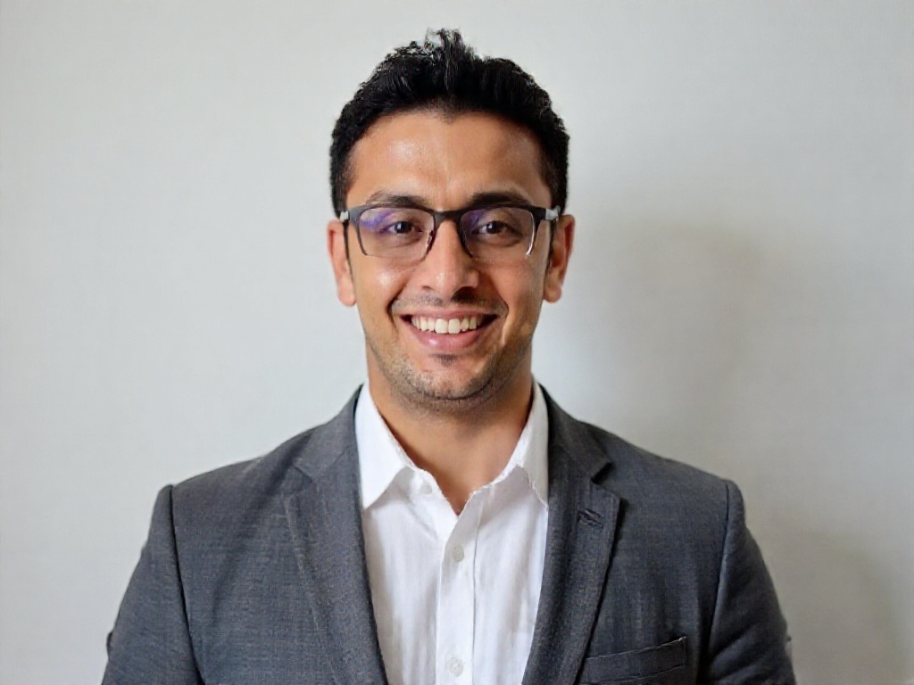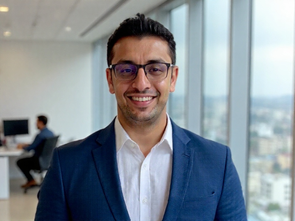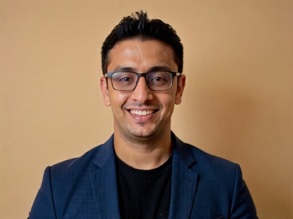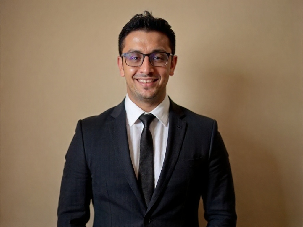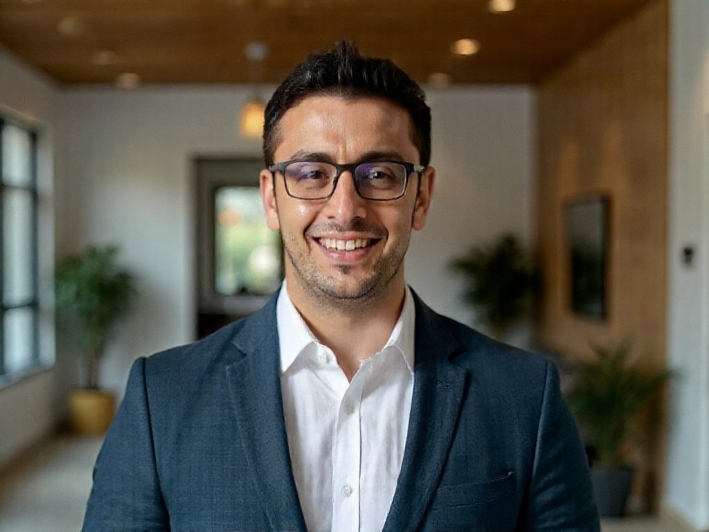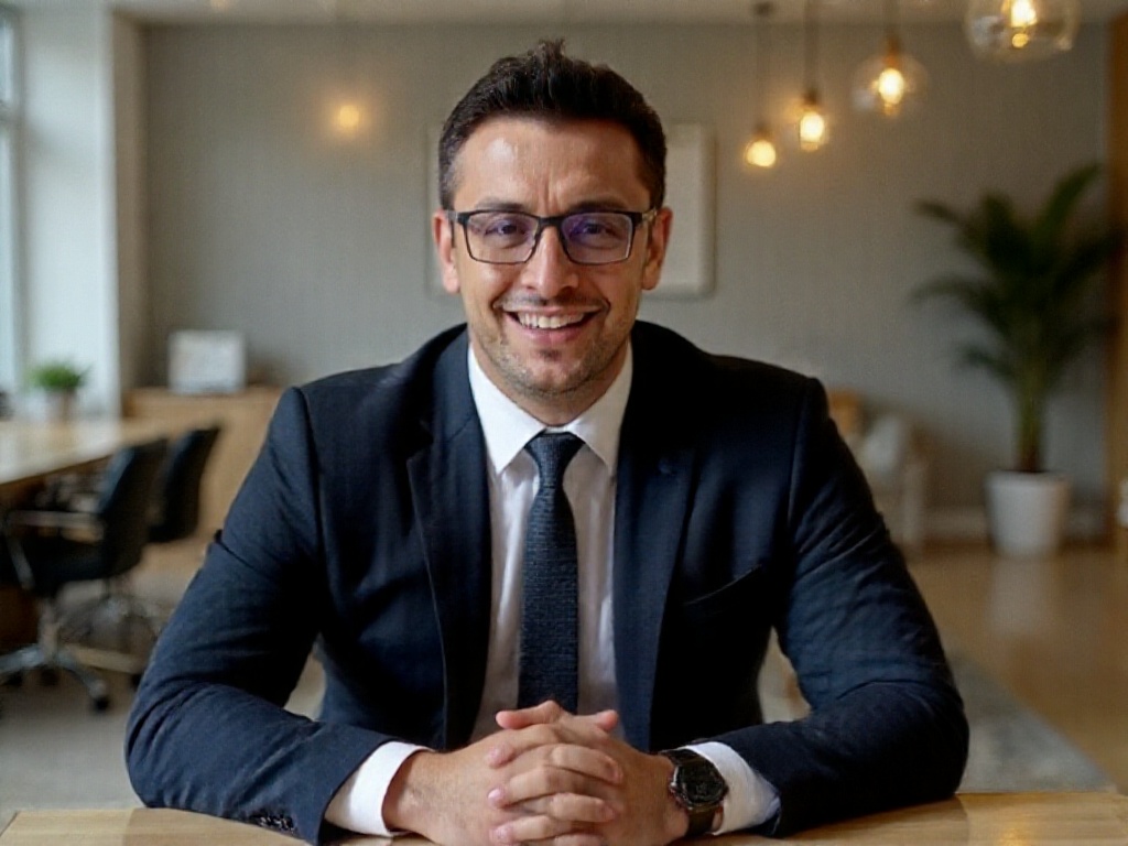 A modern corporate portrait of a man in a dark green suit and white shirt, posed in front of a styli...