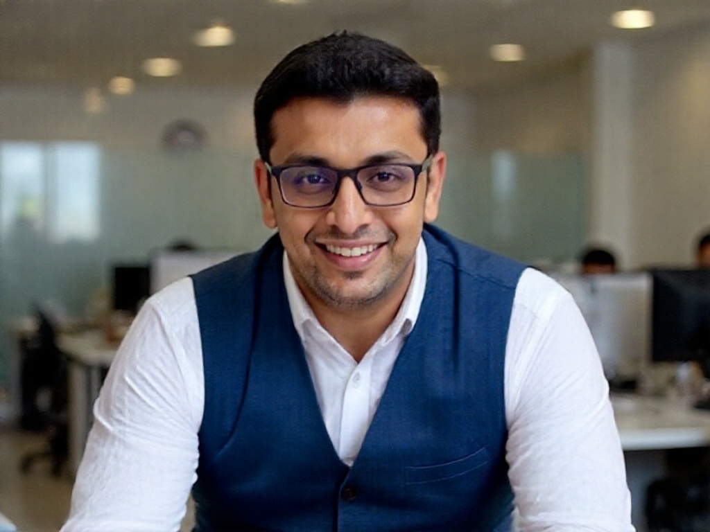 A candid-style portrait of a man in a white shirt and navy vest, leaning slightly against a desk in ...