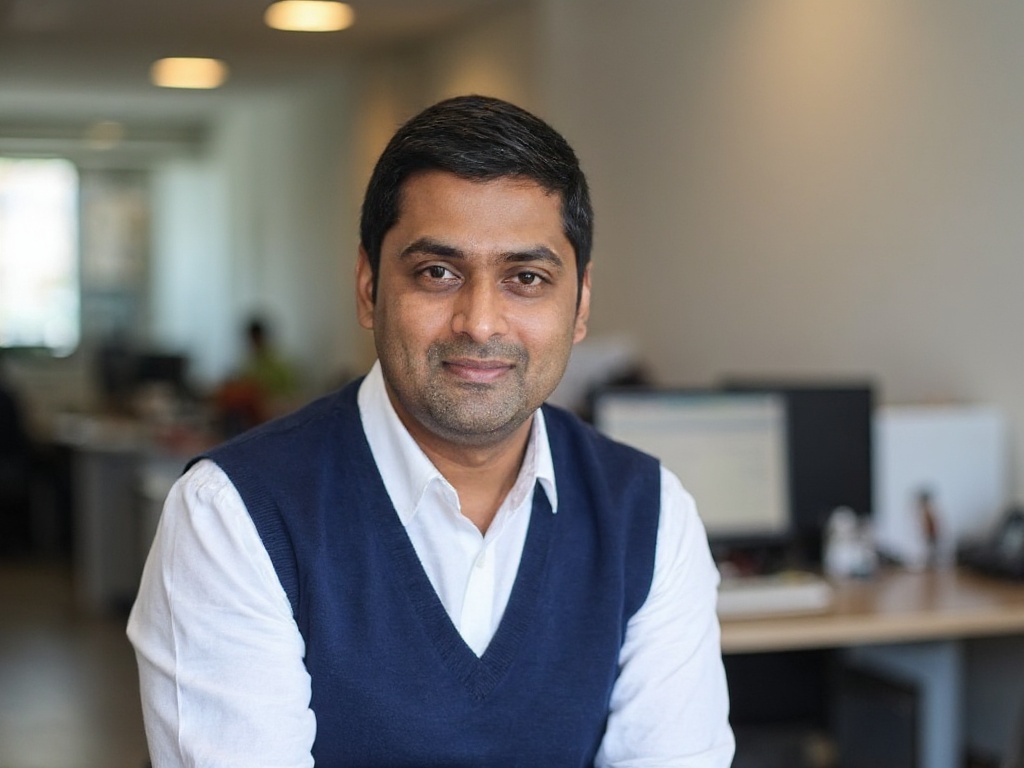 A candid-style portrait of a man in a white shirt and navy vest, leaning slightly against a desk in ...