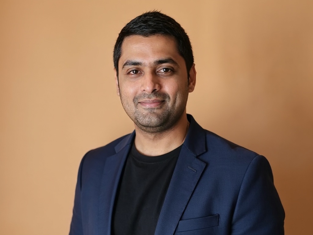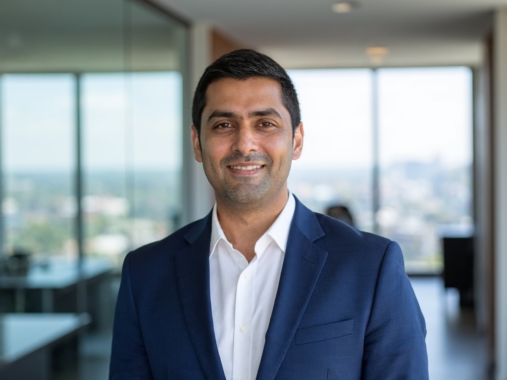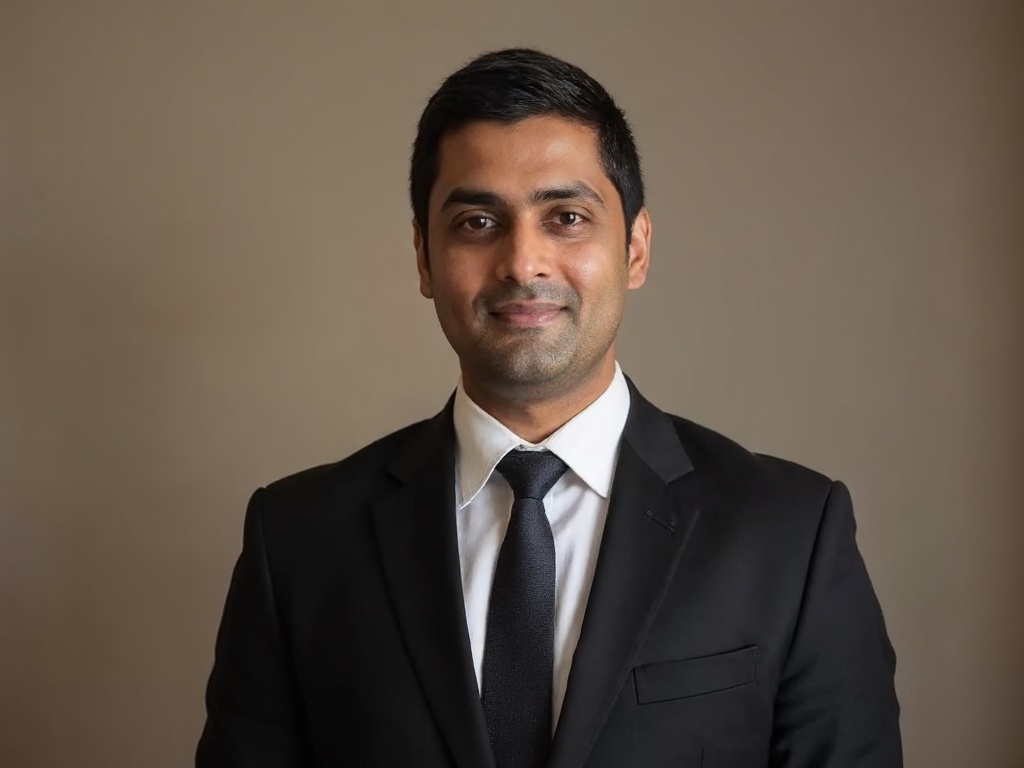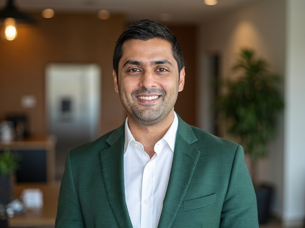 A modern corporate portrait of a man in a dark green suit and white shirt, posed in front of a styli...