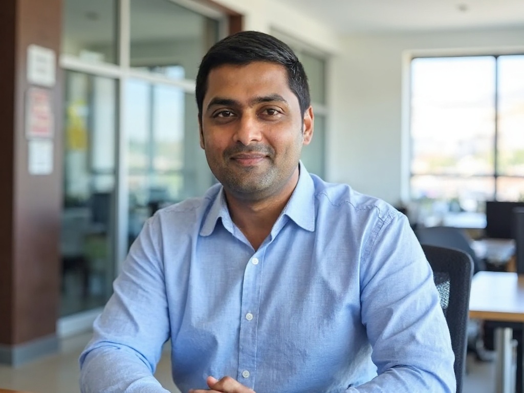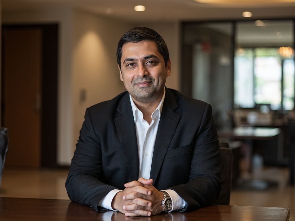 A professional man seated at a glass desk in a contemporary office space, dressed in a light blue dr...