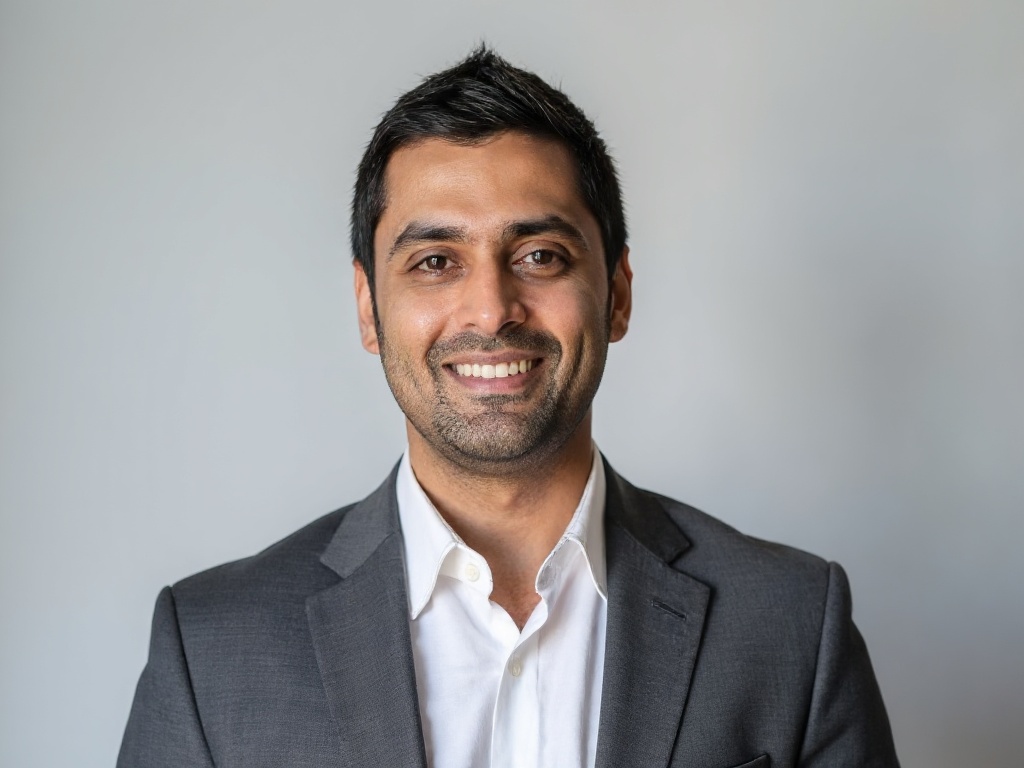 A professional headshot of a confident man in a charcoal gray suit and crisp white shirt, no tie, st...
