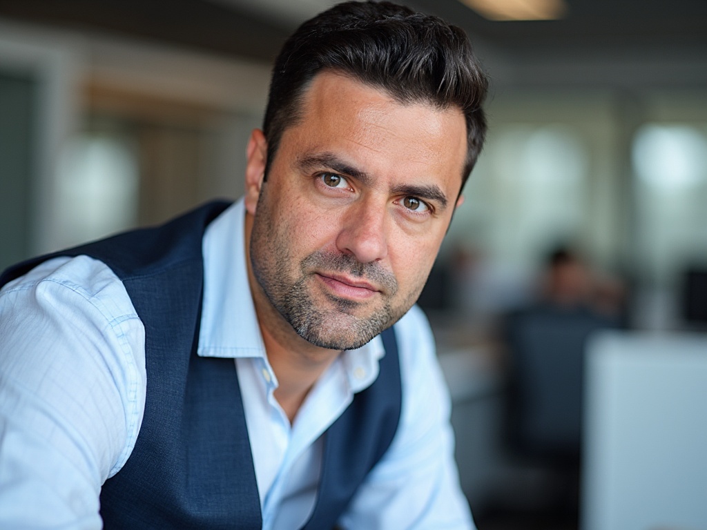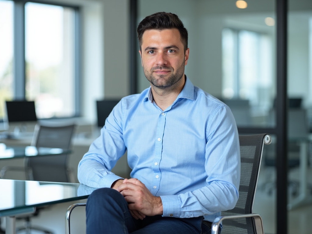 A professional man seated at a glass desk in a contemporary office space, dressed in a light blue dr...