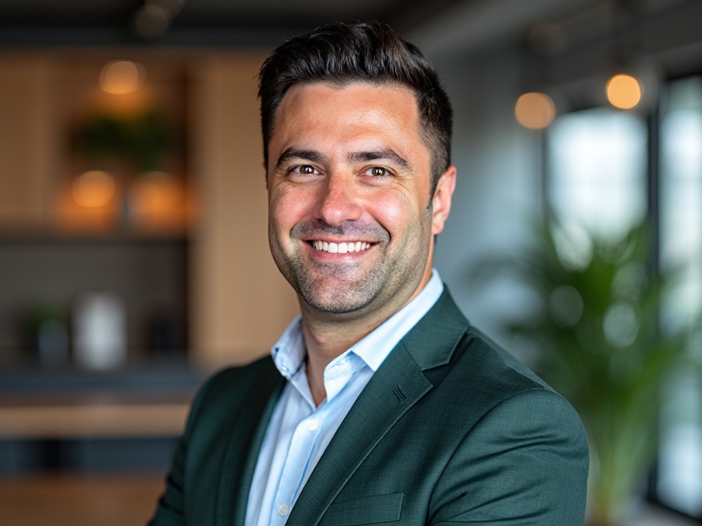 A modern corporate portrait of a man in a dark green suit and white shirt, posed in front of a styli...